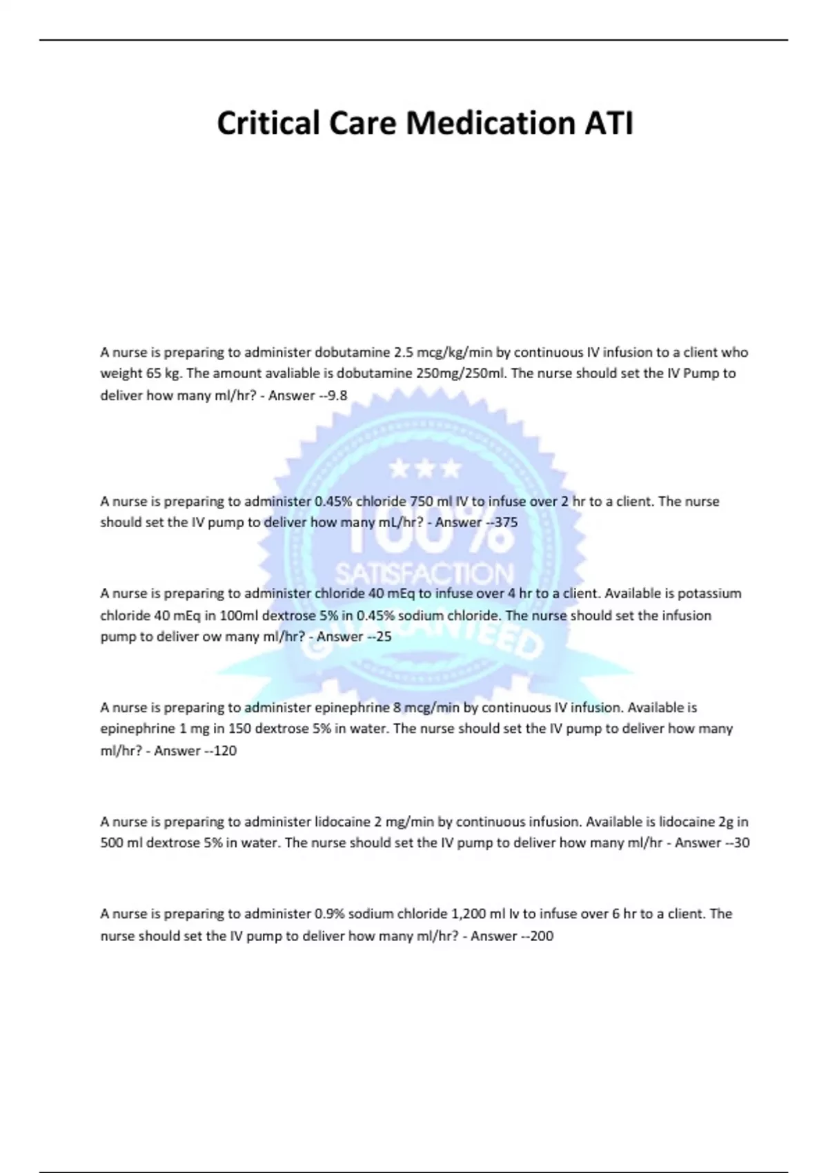 A nurse is preparing to administer dobutamine 2.5 mcg/kg/min by continuous IV infusion to a client who weight 65 kg. The amount avaliable is dobutamine 250mg/250ml. The nurse should set the IV Pump to deliver how many ml/hr? - Answer --9.8 A nurse is preparing to administer 0.45% chloride 750 ml IV to infuse over 2 hr to a client. The nurse should set the IV pump to deliver how many mL/hr? - Answer --375 A nurse is preparing to administer chloride 40 mEq to infuse over 4 hr to a client. Available is potassium chloride 40 mEq in 100ml dextrose 5% in 0.45% sodium chloride. The nurse should set the infusion pump to deliver ow many ml/hr? - Answer --25 A nurse is preparing to administer epinephrine 8 mcg/min by continuous IV infusion. Available is epinephrine 1 mg in 150 dextrose 5% in water. The nurse should set the IV pump to deliver how many ml/hr? - Answer --120 A nurse is preparing to administer lidocaine 2 mg/min by continuous infusion. Available is lidocaine 2g in 500 ml dextrose 5% in water. The nurse should set the IV pump to deliver how many ml/hr - Answer --30 A nurse is preparing to administer 0.9% sodium chloride 1,200 ml Iv to infuse over 6 hr to a client. The nurse should set the IV pump to deliver how many ml/hr? - Answer --200 A