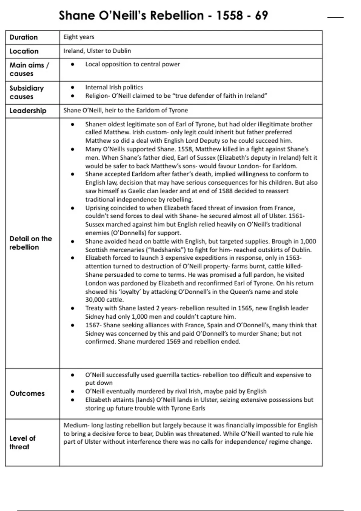 This document has a summary of Edward VI and Mary I rebellions including, dates, location, causes, leadership, key information, outcomes and threat level. It has been written by a tudent who consistenly received A*s throughout the course. Using this document in conjunction with the other monarchs covers Topics 1 - 3 for the Tudor Rebellions and Disorder Unit (OCR).