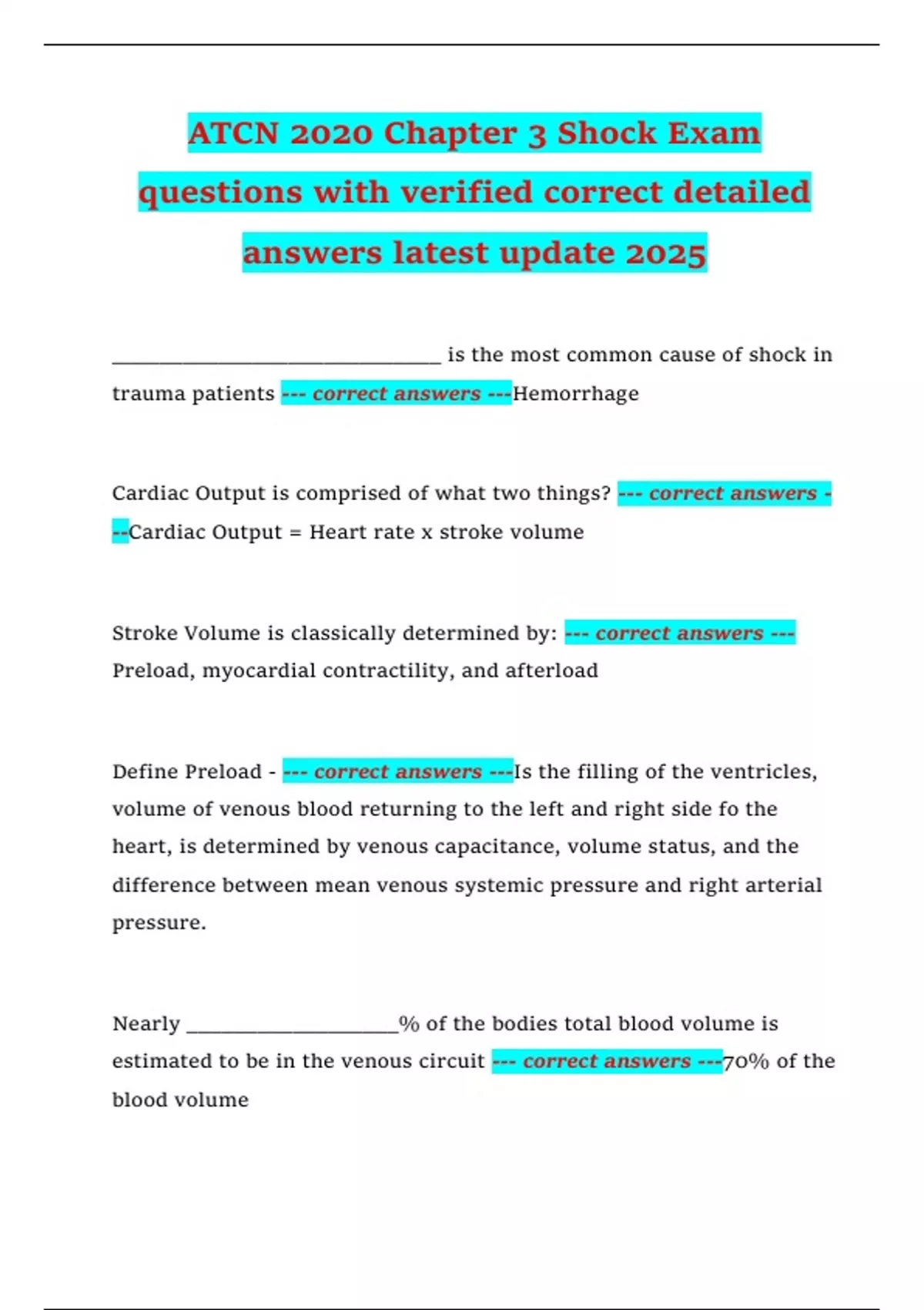 ATCN 2020 Chapter 3 Shock Exam questions with verified correct detailed answers latest update 2025 ____________________________ is the most common cause of shock in trauma patients --- correct answers ---Hemorrhage Cardiac Output is comprised of what two things? --- correct answers ---Cardiac Output = Heart rate x stroke volume Stroke Volume is classically determined by: --- correct answers ---Preload, myocardial contractility, and afterload Define Preload - --- correct answers ---Is the filling of the ventricles, volume of venous blood returning to the left and right side fo the heart, is determined by venous capacitance, volume status, and the difference between mean venous systemic pressure and right arterial pressure.