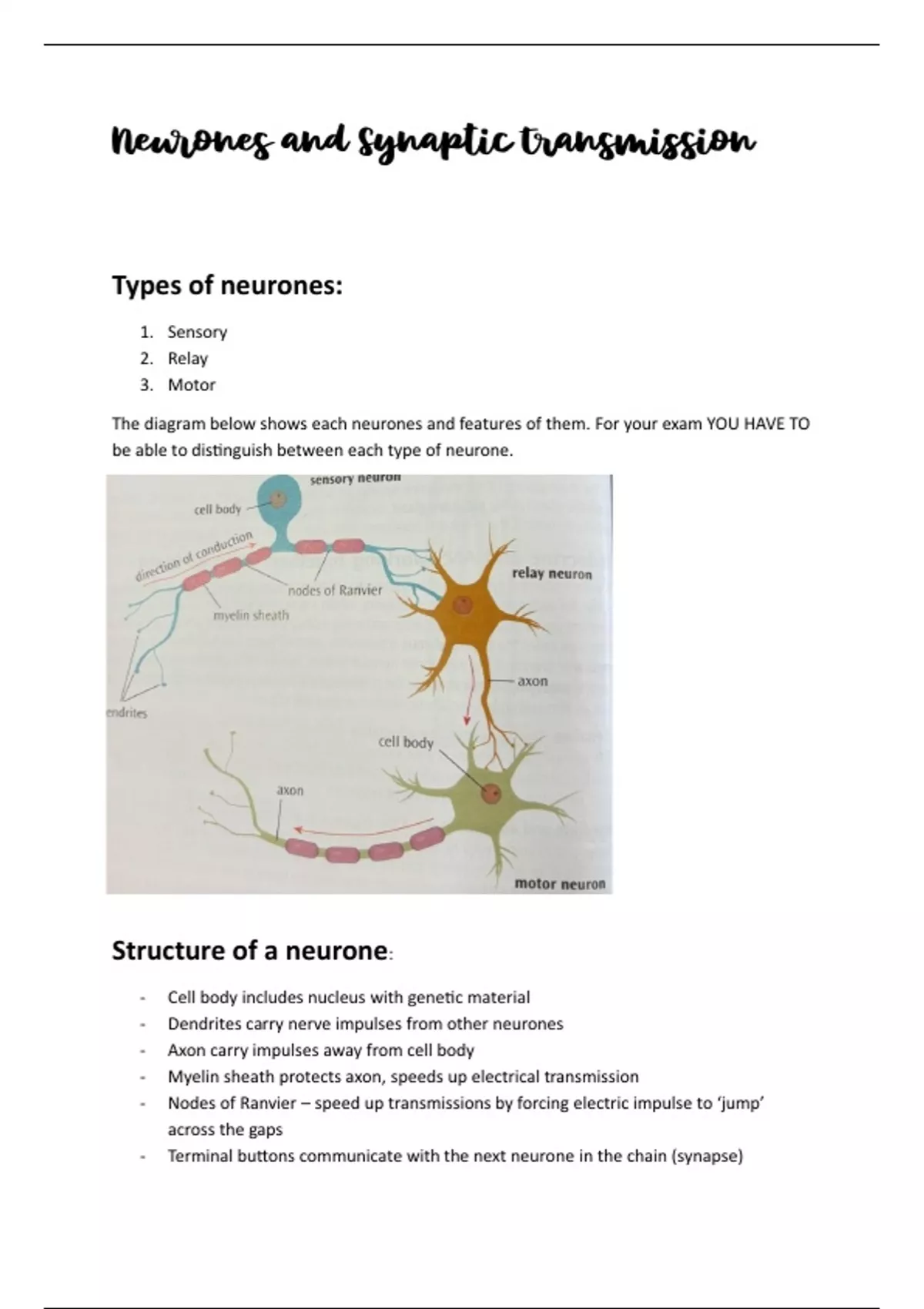 Summary AQA Psychology Biopsychology paper 2 - neurones and neurotransmitters
