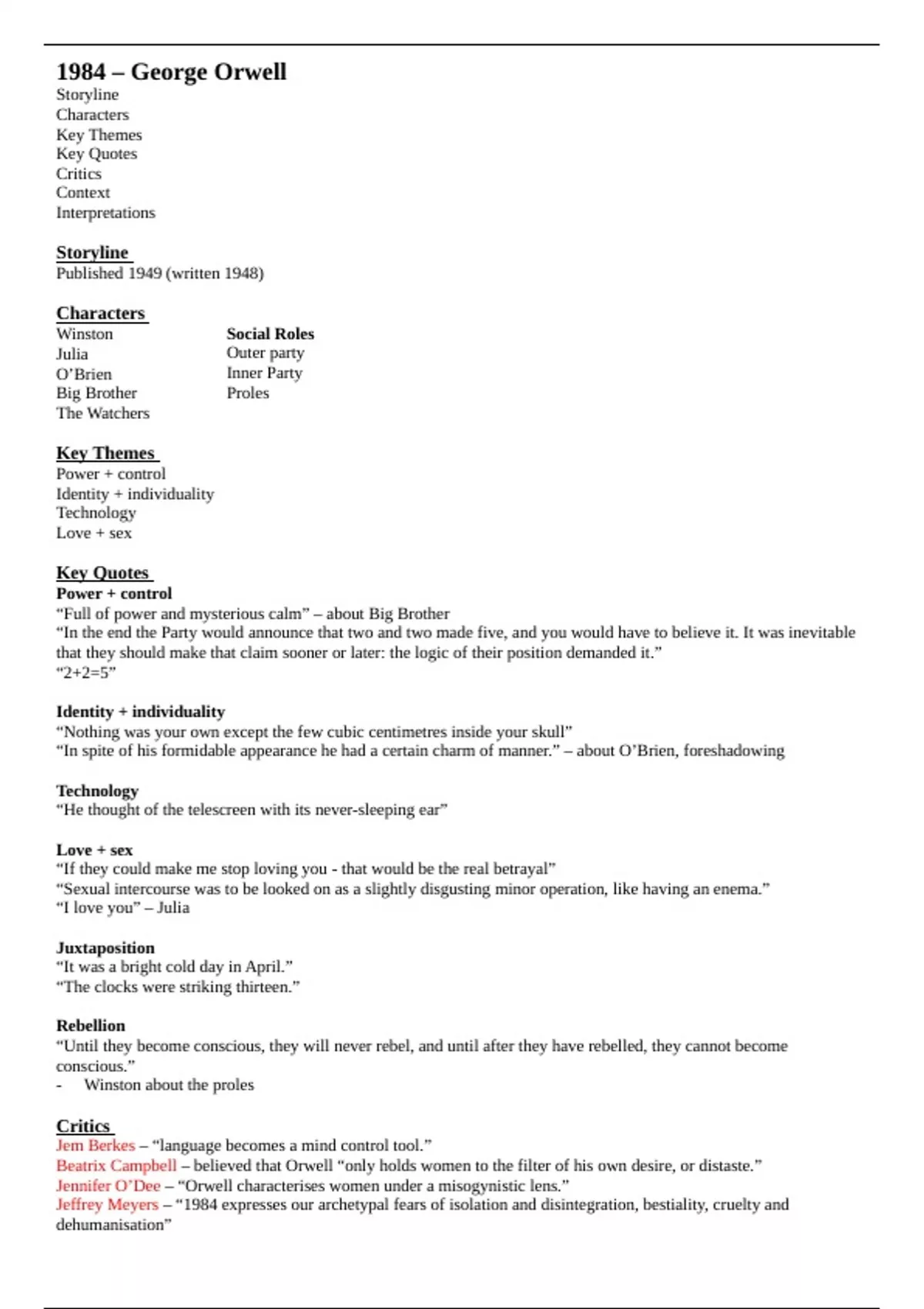 These are revision notes for A-Level English Literature, for the dystopian section of Paper 2, for the novel 1984 by George Orwell. It includes context, critics, and quotations from the novel.