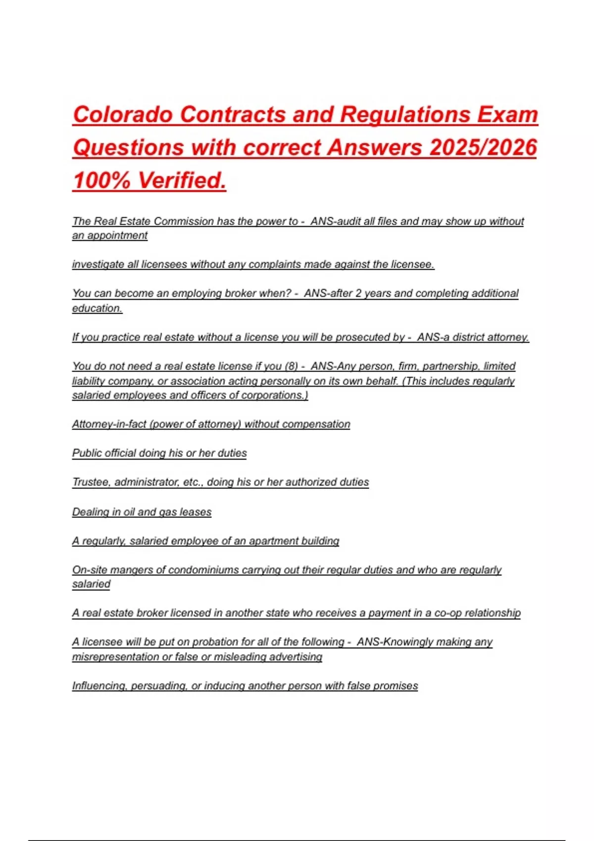 Colorado Contracts and Regulations Exam Questions with correct Answers 2025/2026 100% Verified.