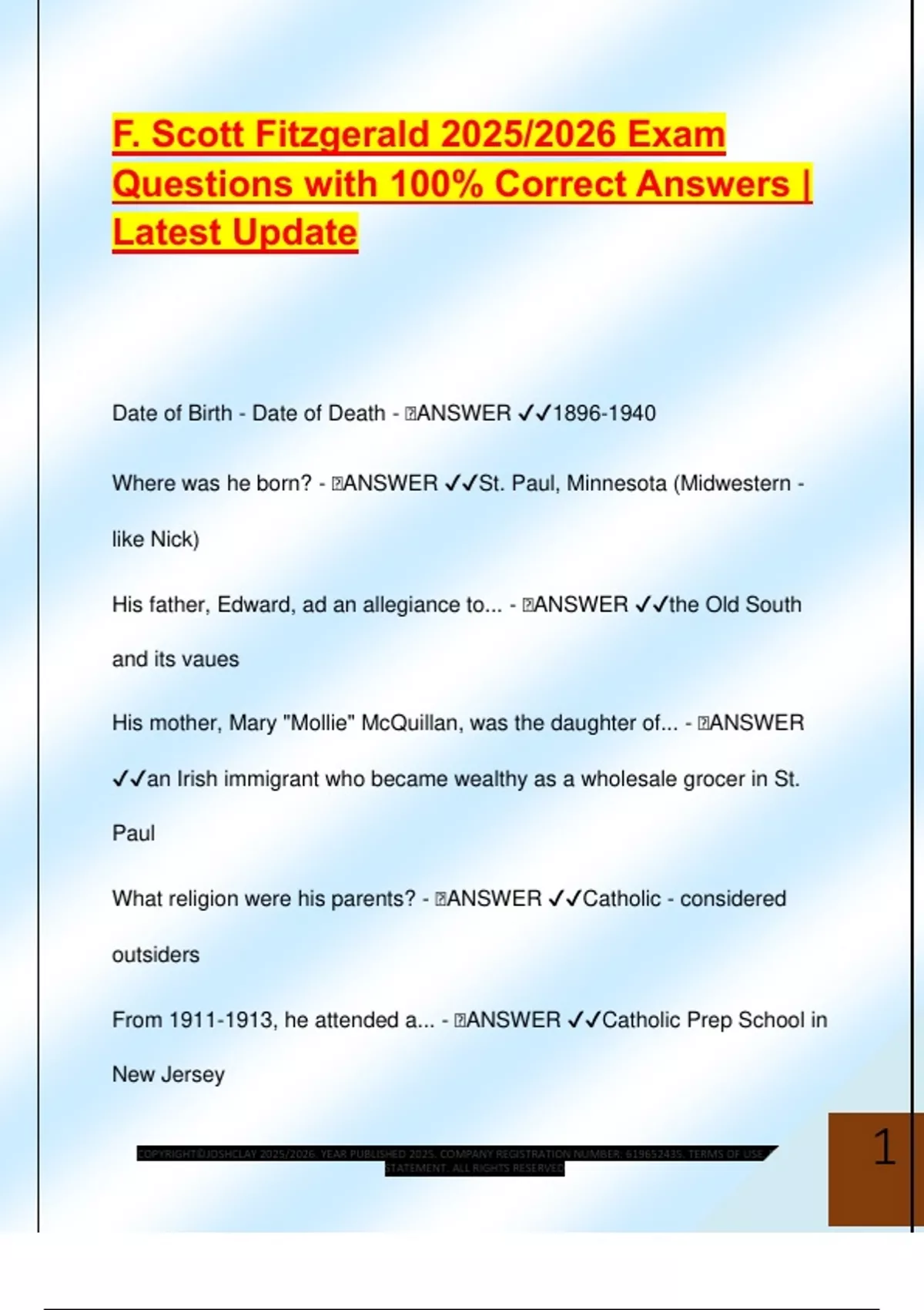 F. Scott Fitzgerald 2025/2026 Exam Questions with 100% Correct Answers | Latest Update Date of Birth - Date of Death -