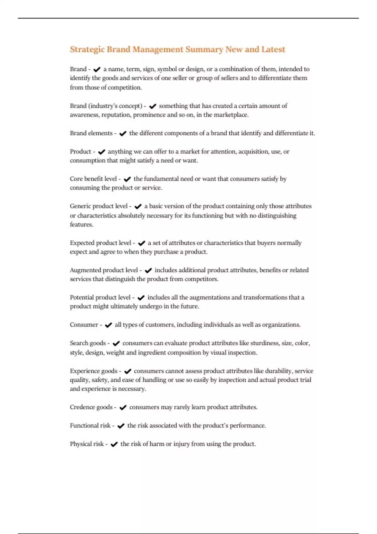 Strategic Brand Management Summary New and Latest Brand - a name, term, sign, symbol or design, or a combination of them, intended to identify the goods and services of one seller or group of sellers and to differentiate them from those of competition. Brand (industry's concept) - something that has created a certain amount of awareness, reputation, prominence and so on, in the marketplace. Brand elements - the different components of a brand that identify and differentiate it. Product - anything we can offer to a market for attention, acquisition, use, or consumption that might satisfy a need or want. Core benefit level - the fundamental need or want that consumers satisfy by consuming the product or service. Generic product level - a basic version of the product containing only those attributes or characteristics absolutely necessary for its functioning but with no distinguishing features. Expected product level - a set of attributes or characteristics that buyers normally expect and agree to when they purchase a product. Augmented product level - includes additional product attributes, benefits or related services that distinguish the product from competitors. Potential product level - includes all the augmentations and transformations that a product might ultimately undergo in the future. Consumer - all types of customers, including individuals as well as organizations. Search goods - consumers can evaluate product attributes like sturdiness, size, color, style, design, weight and ingredient composition by visual inspection. Experience goods - consumers cannot assess product attributes like durability, service quality, safety, and ease of handling or use so easily by inspection and actual product trial and experience is necessary. Credence goods - consumers may rarely learn product attributes. Functional risk - the risk associated with the product's performance. Physical risk - the risk of harm or injury from using the product. Financial risk - the risk of monetary loss associated with the purchase. Social risk - the risk of social embarrassment or disapproval from using the product. Psychological risk - the risk of negative emotional impact from using the product. Time risk - the risk associated with the time spent on the purchase or use of the product. Intellectual property rights - ensure that the firm can safely invest in the brand and reap the benefits of a valuable asset. Branding - creates mental structures and helps consumers organize their knowledge about products and services. Physical goods - traditionally associated with brands and include many of the best-known and highly regarded consumer products. Business-to-business products - the B2B market makes up a huge percentage of the global economy. High-tech products - these firms often lack any kind of brand strategy and sometimes see branding as simply naming their products. Services - although strong service brands have existed for years, the pervasiveness of service branding and its sophistication have accelerated in the past decade. Professional services - offer specialized expertise and support to other businesses and organizations. Retailers and distributors - Brands help retailers create an image and establish positioning. Digital brands - Online marketers now realize the realities of brand building. Off-line activities - Strategies to attract customers to online platforms. Unique value propositions - Distinct benefits offered to specific customer groups. Brand recognition - Awareness of a brand's identity and offerings. Brand meanings - Interpretations derived from programs and products. Sports marketing - Promotion of sports teams through diverse strategies.