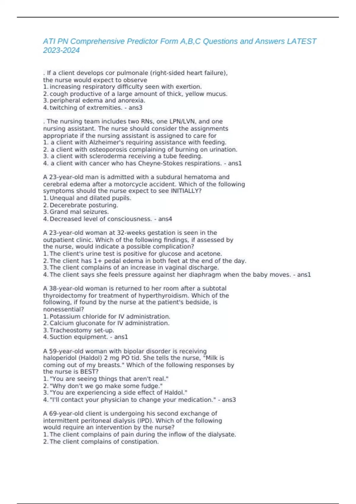 ATI PN Comprehensive Predictor Form A,B,C Questions and Answers LATEST