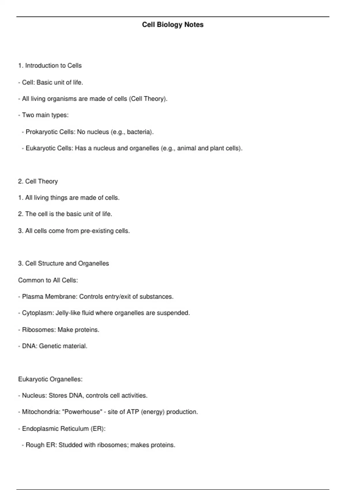 This university-level cell biology document provides a comprehensive and in-depth overview of cellular structure, function, and molecular processes. It begins with the foundational principles of cell theory and distinguishes between prokaryotic and eukaryotic cells in terms of organization, genetic material, and organelles. The document elaborates on the structure and function of the plasma membrane, describing the fluid mosaic model and various transport mechanisms including passive and active transport, endocytosis, and exocytosis. It covers all major organelles in detail, such as the nucleus, mitochondria, endoplasmic reticulum, Golgi apparatus, lysosomes, peroxisomes, and the cytoskeleton, explaining their roles in maintaining cell function and homeostasis. The notes also explore the processes of gene expression, from DNA transcription to RNA processing and protein synthesis, highlighting post-translational modifications that regulate protein function. Cell signaling is thoroughly discussed, including types of cell communication (autocrine, paracrine, endocrine, and juxtacrine), receptor-ligand interactions, and major signaling pathways involving second messengers like cAMP and calcium ions. The document explains the cell cycle in depth, including its regulation by checkpoints and the processes of mitosis and apoptosis. It also addresses cellular metabolism, covering glycolysis, the citric acid cycle, oxidative phosphorylation, and anaerobic fermentation. In addition, the extracellular matrix and cell adhesion mechanisms are outlined, with emphasis on integrins and various cell junctions. Advanced topics include cancer cell biology, focusing on oncogenes, tumor suppressor genes, and the hallmarks of cancer such as uncontrolled proliferation and resistance to cell death. The notes integrate modern techniques used in cell biology research, such as microscopy (light, fluorescence, confocal, electron), Western blotting, PCR, immunostaining, flow cytometry, and cell fractionation. Overall, the document serves as a detailed academic resource ideal for university courses in cell biology, biochemistry, or molecular biology, and is useful for both exam preparation and research foundations.