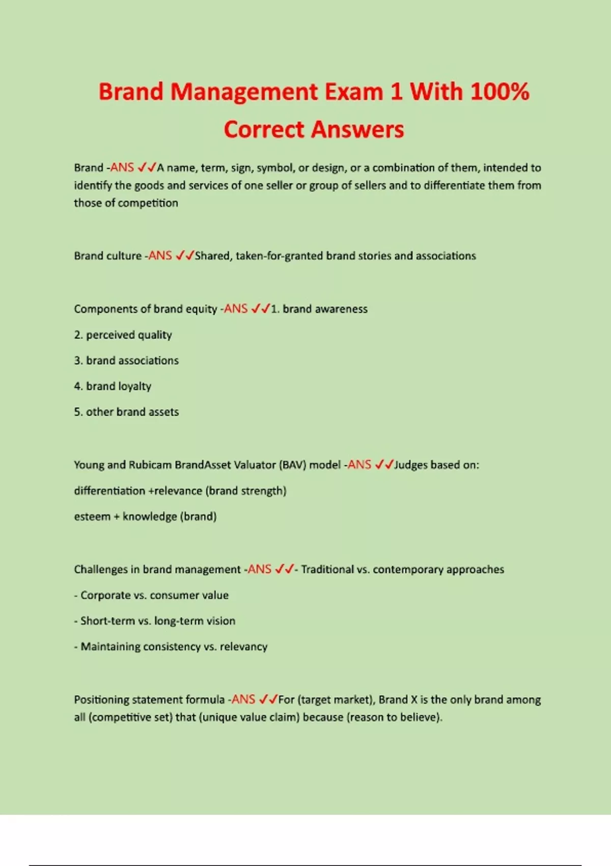 Brand Management Exam 1 With 100% Correct Answers Brand -ANS A name, term, sign, symbol, or design, or a combination of them, intended to identify the goods and services of one seller or group of sellers and to differentiate them from those of competition Brand culture -ANS Shared, taken-for-granted brand stories and associations Components of brand equity -ANS 1. brand awareness 2. perceived quality 3. brand associations 4. brand loyalty 5. other brand assets Young and Rubicam BrandAsset Valuator (BAV) model -ANS Judges based on: differentiation +relevance (brand strength) esteem + knowledge (brand) Challenges in brand management -ANS - Traditional vs. contemporary approaches - Corporate vs. consumer value - Short-term vs. long-term vision - Maintaining consistency vs. relevancy Positioning statement formula -ANS For (target market), Brand X is the only brand among all (competitive set) that (unique value claim) because (reason to believe). Brand elements -ANS Memorable Meaningful Likeable Transferrable Adaptable Protectable Brand positioning -ANS The way a brand is perceived within a given competitive set in the consumer's mind