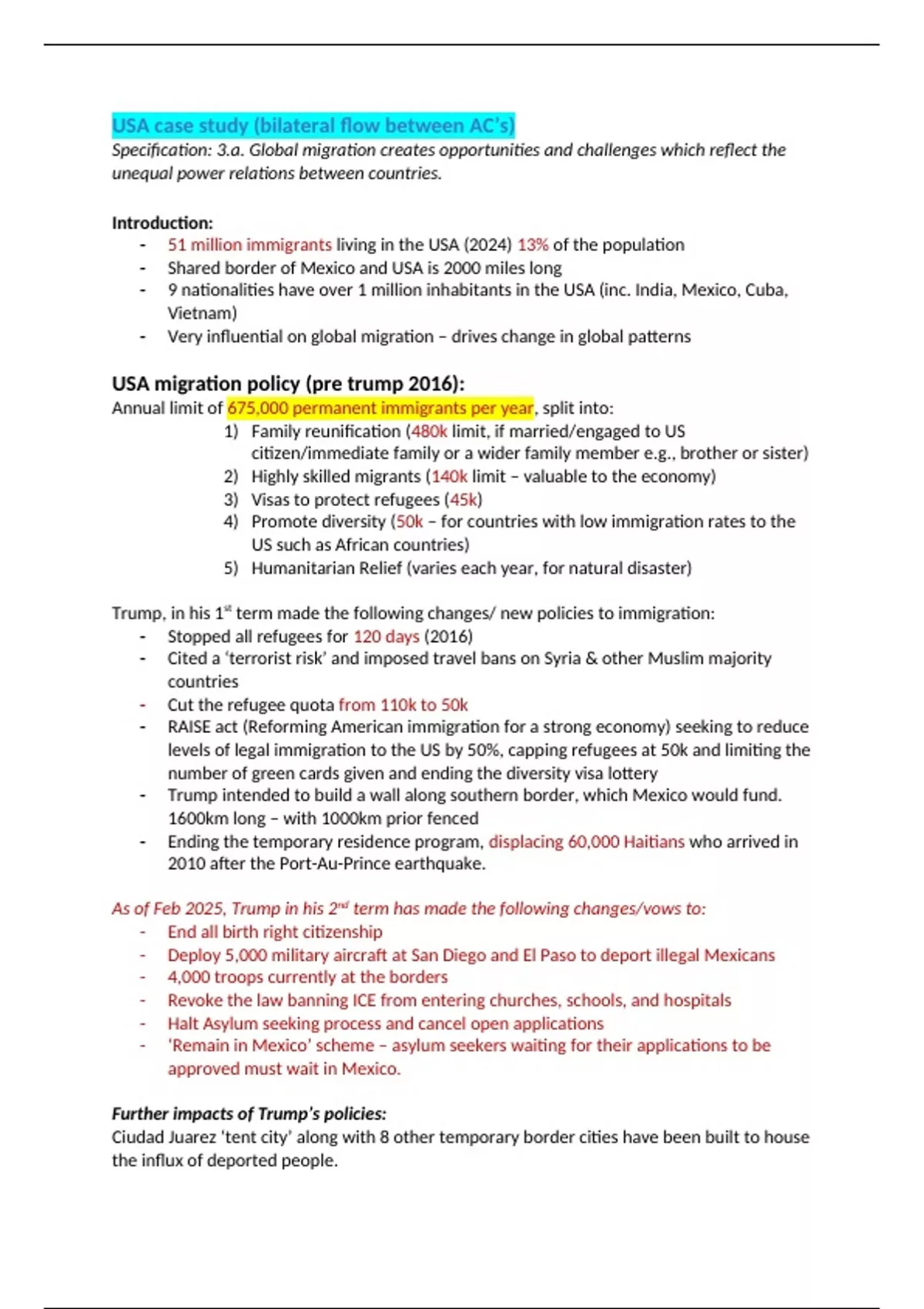 Case study notes for an AC influencing migration patterns for the migration topic of OCR a-level geography. These notes have gotten me A*'s in mock examinations, and are up to date in light of recent changes to USA migration policies