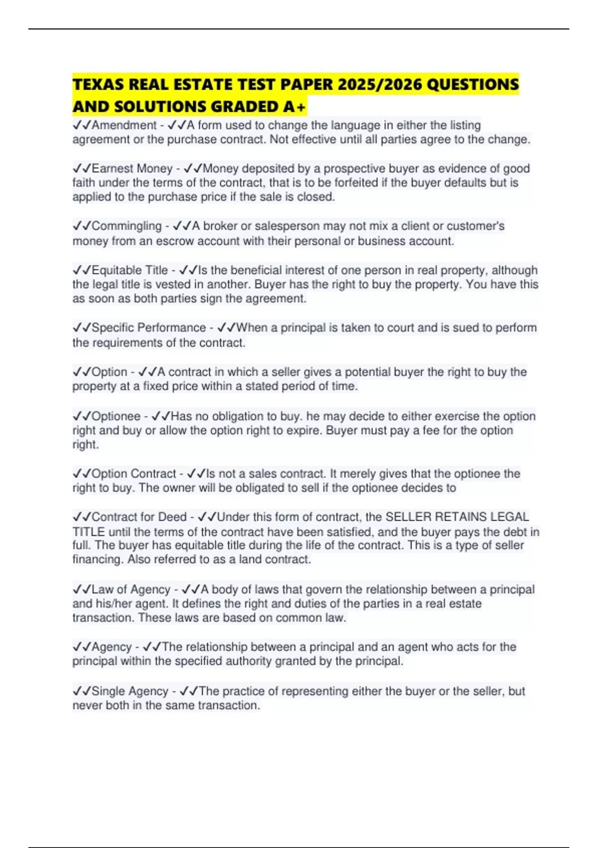 TEXAS REAL ESTATE TEST PAPER 2025/2026 QUESTIONS