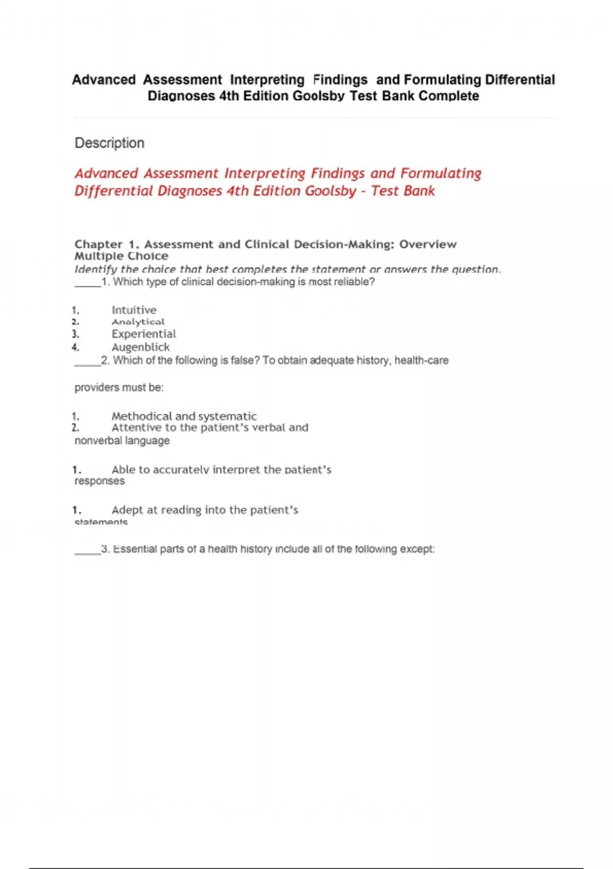 Advanced Assessment Interpreting Findings and Formulating Differential Diagnoses 4th Edition Goolsby Test Bank Complete