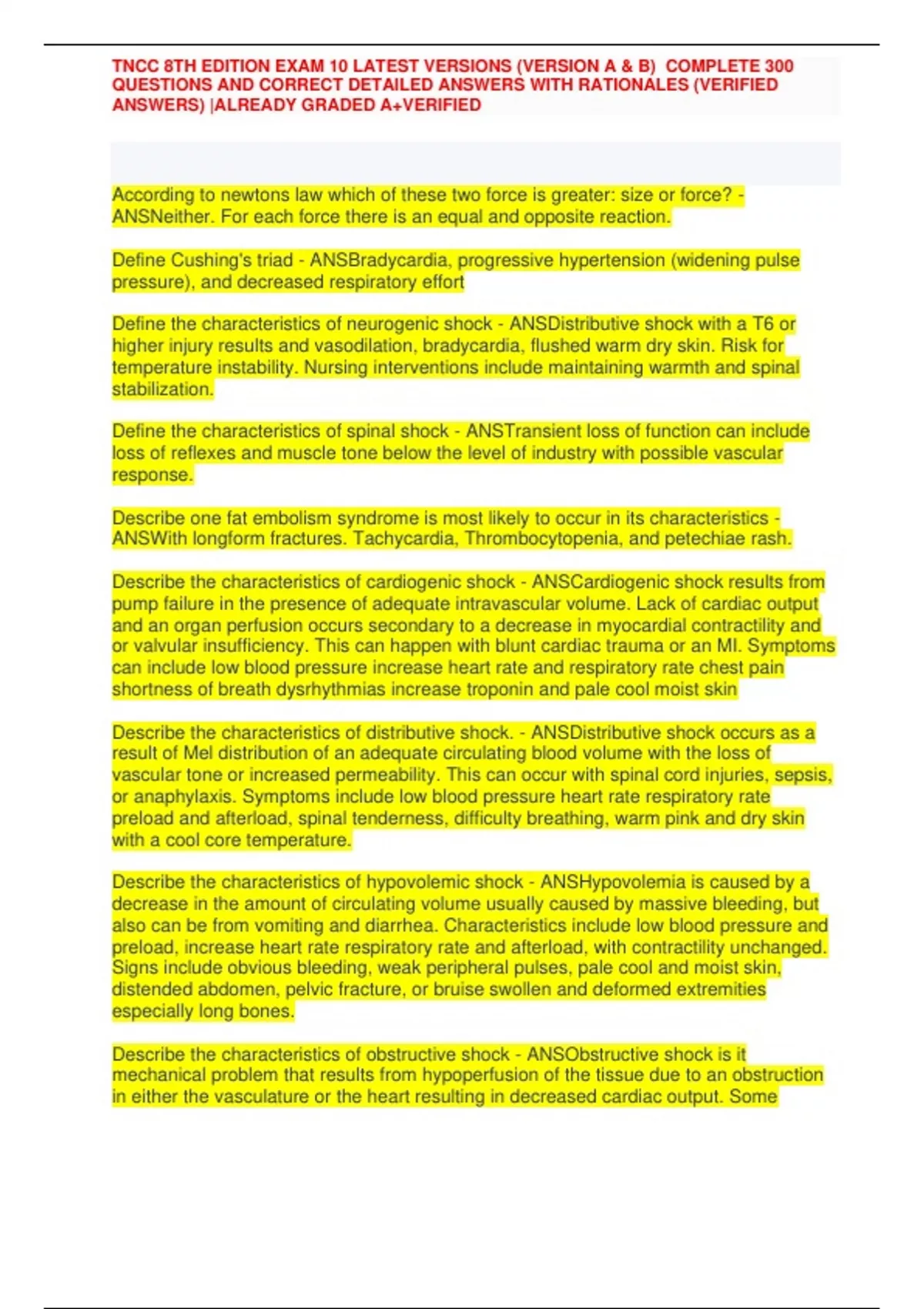 TNCC 8TH EDITION EXAM 10 LATEST VERSIONS (VERSION A & B) COMPLETE 300 QUESTIONS AND