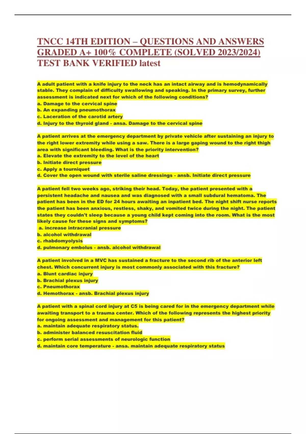 , TNCC 14TH EDITION – QUESTIONS AND ANSWERS