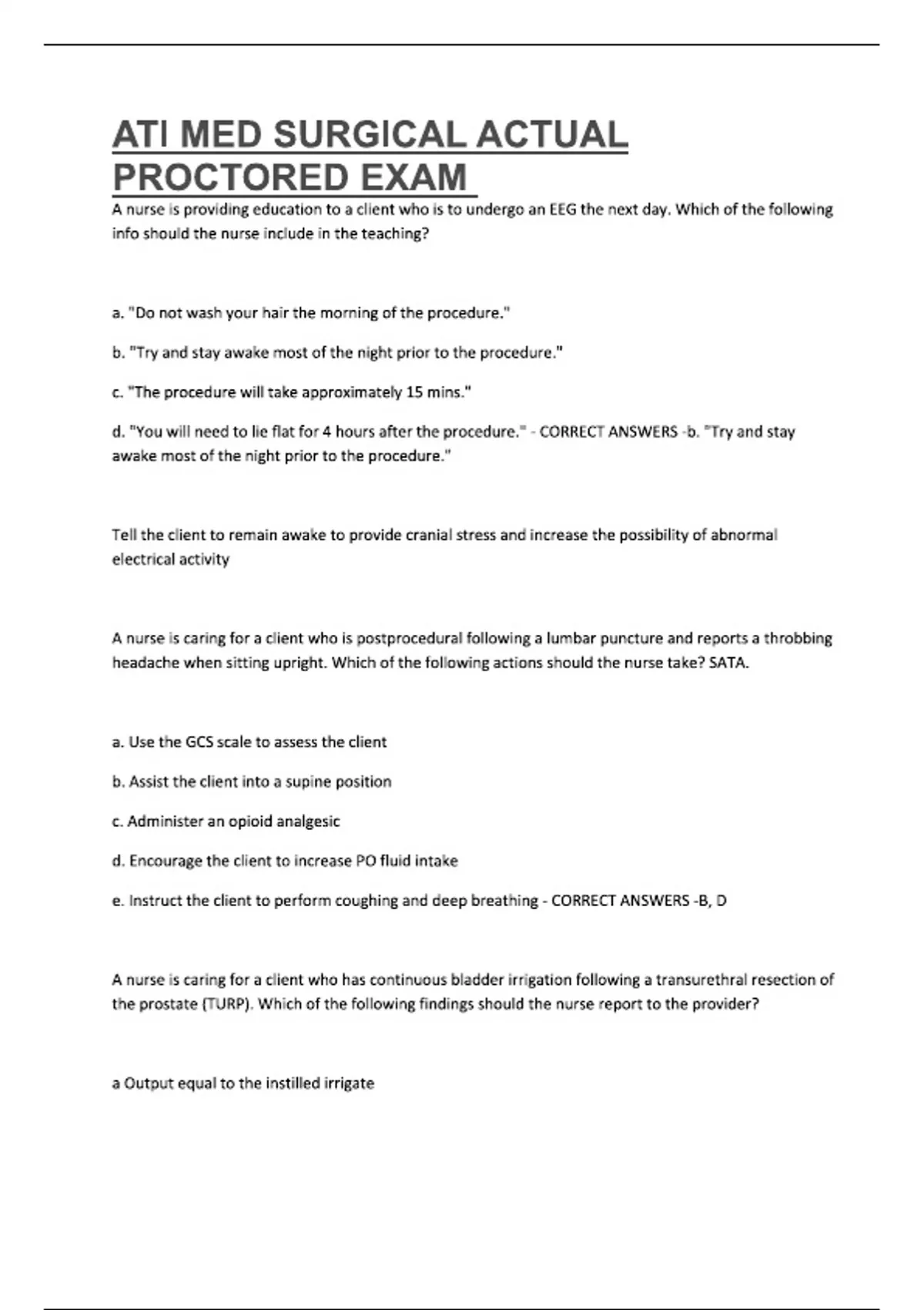 ATI MED SURGICAL ACTUAL PROCTORED EXAM A nurse is providing education to a client who is to undergo an EEG the next day. Which of the following info should the nurse include in the teaching? a. "Do not wash your hair the morning of the procedure." b. "Try and stay awake most of the night prior to the procedure." c. "The procedure will take approximately 15 mins." d. "You will need to lie flat for 4 hours after the procedure." - CORRECT ANSWERS -b. "Try and stay awake most of the night prior to the procedure." Tell the client to remain awake to provide cranial stress and increase the possibility of abnormal electrical activity A nurse is caring for a client who is postprocedural following a lumbar puncture and reports a throbbing headache when sitting upright. Which of the following actions should the nurse take? SATA. a. Use the GCS scale to assess the client b. Assist the client into a supine position c. Administer an opioid analgesic d. Encourage the client to increase PO fluid intake e. Instruct the client to perform coughing and deep breathing - CORRECT ANSWERS -B, D A nurse is caring for a client who has continuous bladder irrigation following a transurethral resection of the prostate (TURP). Which of the following findings should the nurse report to the provider? a Output equal to the instilled irrigate