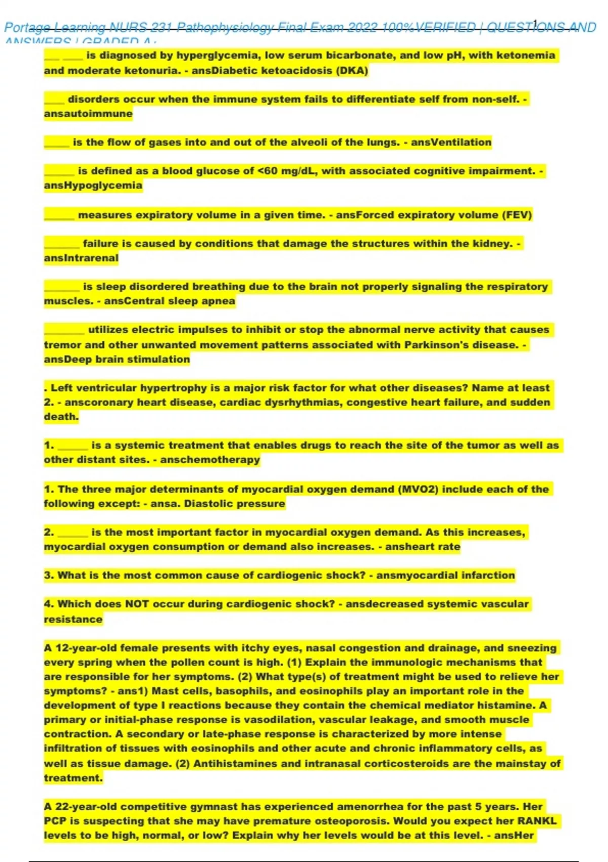 Portage Learning NURS 231 Pathophysiology Final Exam 2022 100%VERIFIED | QUESTIONS AND