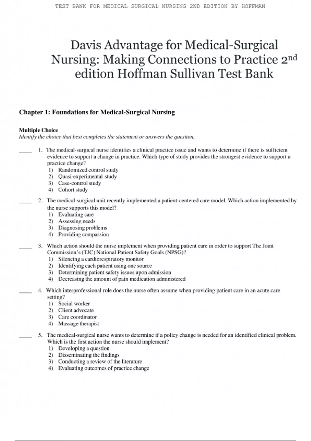 Access the complete Test Bank for Medical-Surgical Nursing: Making Connections to Practice, 2nd Edition. This test bank offers NCLEX-style questions with rationales focusing on clinical application, patient assessment, nursing interventions, and collaborative care in medical-surgical nursing. Ideal for nursing students preparing for exams and practical clinical settings.