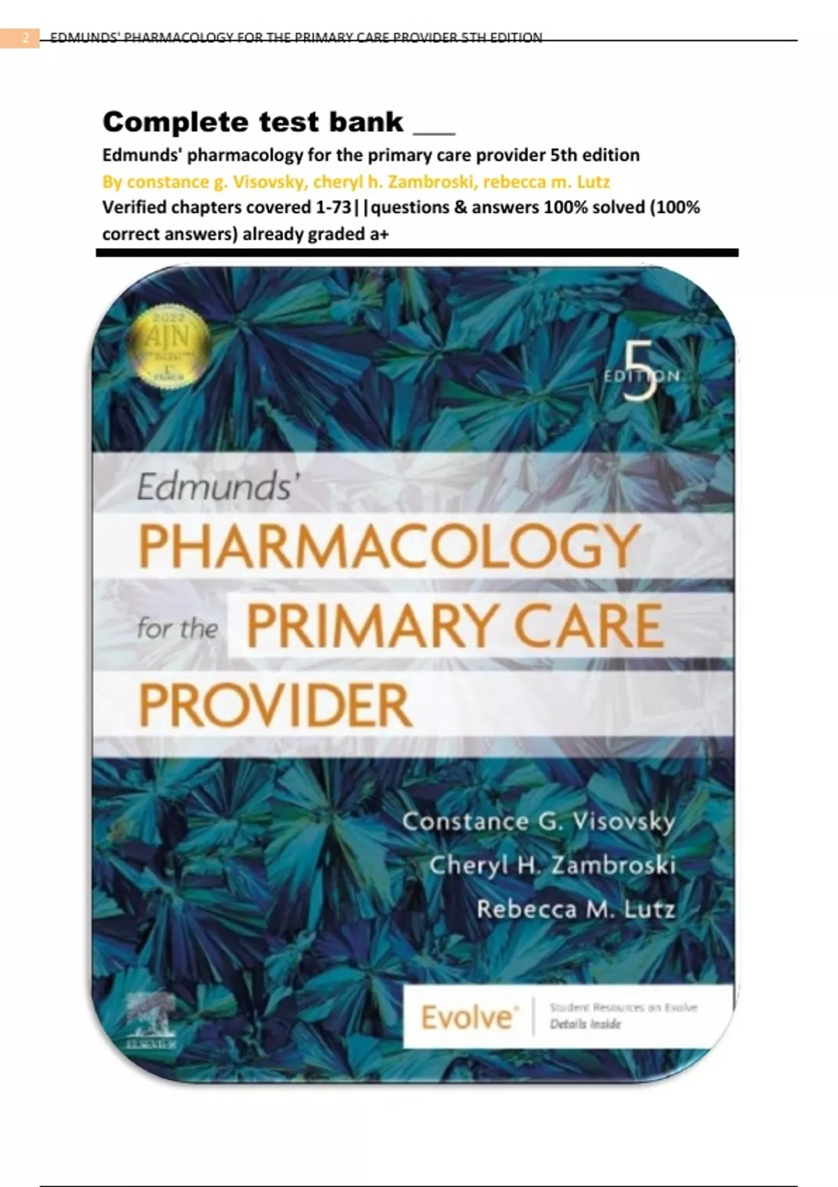 COMPLETE TEST BANK ___ EDMUNDS' PHARMACOLOGY FOR THE PRIMARY CARE PROVIDER 5TH EDITION BY CONSTANCE G. VISOVSKY, CHERYL H. ZAMBROSKI, REBECCA M. LUTZ VERIFIED CHAPTERS COVERED 1-54||QUESTIONS & ANSWERS 100% SOLVED (100% CORRE