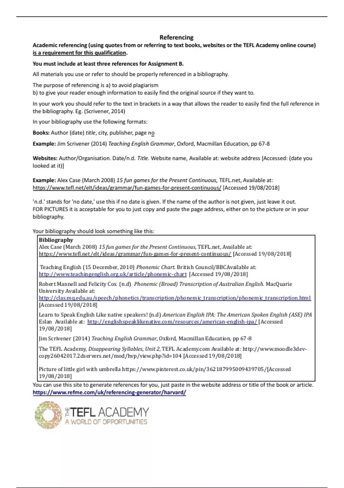 Academic referencing (using quotes from or referring to text books, websites or the TEFL Academy online course)