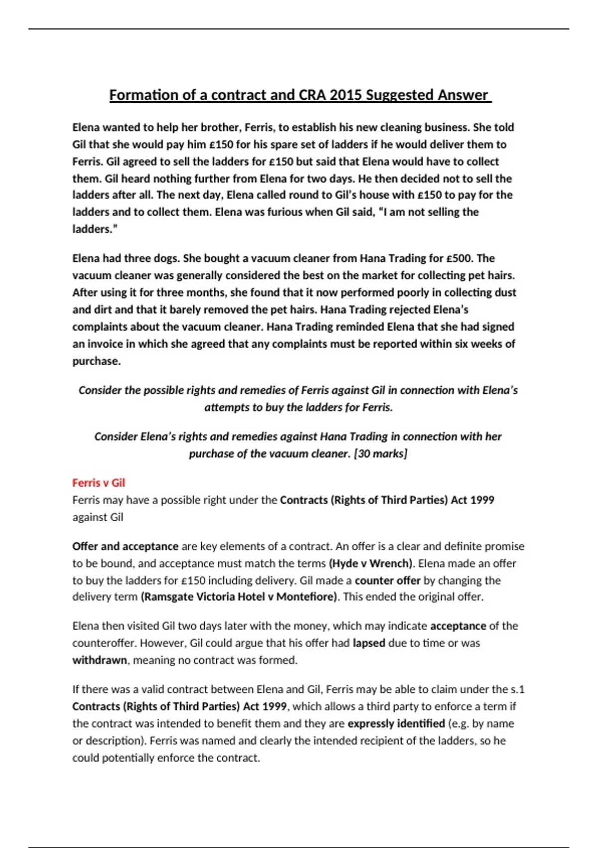 This high-quality suggested answer covers a 30-mark scenario involving Elena, Ferris, and Gil (contract formation and third-party rights), as well as Elena’s complaint against Hana Trading under the Consumer Rights Act 2015. Perfect For: AQA A-Level Law (Paper 1 – Contract) LPC / LLM students studying Contract Law Students looking for model IRAC structure and top-band analysis Topics Covered: Offer and acceptance Counter-offers and lapse of time Contracts (Rights of Third Parties) Act 1999 Consumer Rights Act 2015 (ss.9, 10, 19–24, 31) Exclusion clauses & statutory protection Key Features: Written to a 30/30 standard – clear, concise and exam-focused Case law: Hyde v Wrench, Ramsgate Victoria Hotel v Montefiore, Thornton v Shoe Lane Parking, Baldry v Marshall Clear structure: IRAC format with statutory references and applied analysis Ideal for revising contract formation and consumer rights remedies Instant download – ready to use for revision, exam prep, or coursework support. ‍⚖️ Ace your next contract law question with this top-grade model answer!