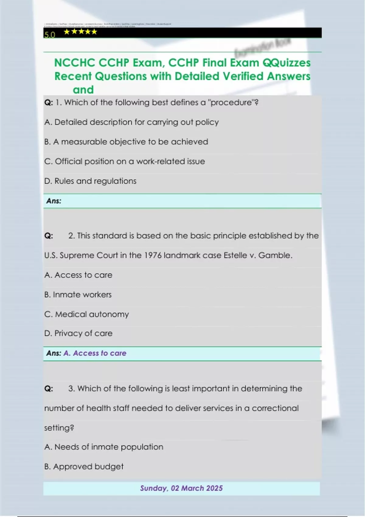 NCCHC CCHP Exam, CCHP Final Exam - Quizzes Recent Questions with Detailed Verified Answers and Correct Answers Already Graded A+