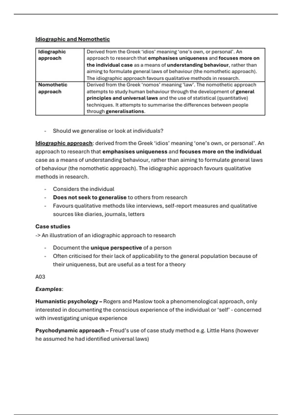 In-depth summary sheets and flashcards for idiographic and nomothetic in the issues and debates topic from an A* A Level psychology student. Includes detailed notes, examples, evaluation and flashcards.