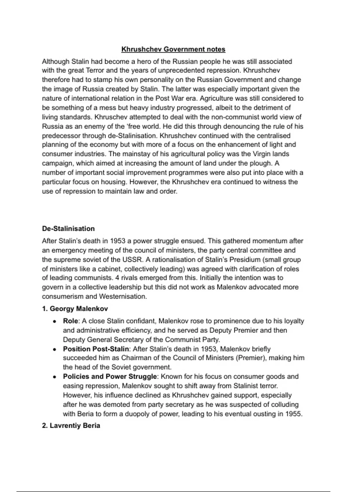 Looking for in depth notes to help your History revision and secure that grade in your A Level exam? Look no further! This detailed A-Level History document covers Khrushchev's leadership from 1953 to 1964, tackling the key themes of government, war, nationalities and economy and society. It looks into his rise to power, de-Stalinisation policies, internal reforms, and Cold War diplomacy as well as political and economic strategies such as decentralisation, the Virgin Lands Campaign, consumer industry focus, education and housing reform, and religious repression. The document also addresses Khrushchev's role in Cold War flashpoints like the Hungarian Uprising and Cuban Missile Crisis, offering a full picture of his domestic and international legacy, created with an exam focus in mind.