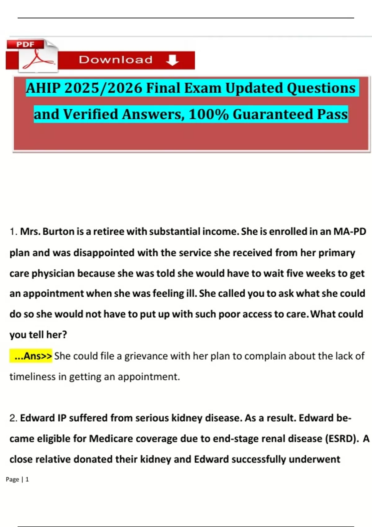 AHIP 2025/2026 Final Exam Updated Questions and Verified Answers, 100% Guaranteed Pass. 1.Mrs. Burton is a retiree with substantial income. She is enrolled in an MA-PD plan and was disappointed with the service she received from her primary care physician because she was told she would have to wait five weeks to get an appointment when she was feeling ill. She called you to ask what she could do so she would not have to put up with such poor access to care. What could you tell her? ...Ans She could file a grievance with her plan to complain about the lack of timeliness in getting an appointment. 2. Edward IP suffered from serious kidney disease. As a result. Edward be- came eligible for Medicare coverage due to end-stage renal disease (ESRD). A close relative donated their kidney and Edward successfully underwent transplant surgery 12 months ago. Edward is now age 50 and asks you if his Medicare coverage will continue, what should you say? ...Ans Individuals eligible for Medicare based on ESRD generally lose eligibility 36 months after the month in which the individual receives a kidney transplant unless they are eligible for Medicare on another basis such as age or disability. Edward may, however, remain enrolled in Part B but solely for coverage of immunosuppressive drugs if he has no other health care coverage that would cover the drugs. 3. Mildred Savage enrolled in Allcare Medicare Advantage plan several years ago. Mildred recently learned that she is suffering from inoperable cancer and has just a few months to live. She would like to spend these final months in hospice care. Mildred's family asks you whether hospice benefits will be paid for under the Allcare Medicare Advantage plan. What should you say? ...Ans Mildred may remain enrolled in Allcare and make a hospice election. Hospice benefits will be paid for by Original Medicare under Part A and Allcare will continue to pay for any non-hospice services. 4. Mr. Diaz continued working with his company and was insured under his employer's group plan until he reached age 68. He has heard that there is a premium penalty for those who did not sign up for Part B when first eligible and wants to know how much he will have to pay. What should you tell him? ...Ans Mr. Diaz will not pay any penalty because he had continuous coverage under his employer's plan. 5. Mr. Moy's wife has a Medicare Advantage plan, but he wants to under- stand what coverage Medicare Supplemental Insurance provides since his health care needs are different from his wife's needs. What could you tell Mr. Moy? ...Ans Medicare Supplemental Insurance would help cover his Part A and Part B deductibles or coinsurance in Original Fee-for-Service (FFS) Medicare as well as possibly some services that Medicare does not cover. 6. Mrs. Chen will be 65 soon, has been a citizen for twelve years, has been employed full time, and paid taxes during that entire period. She is concerned that she will not qualify for coverage under part A because she was not born in the United States. What should you tell her? ...Ans Most individuals who are citizens and age 65 or over are covered under Part A by virtue of having paid Medicare taxes while working, though some may be covered as a result of paying monthly premiums. 7. Mr. Bauer is 49 years old, but eighteen months ago he was declared dis- abled by the Social Security Administration and has been receiving disability payments. He is wondering whether he can obtain coverage under Medicare. What should you tell him? ...Ans After receiving such disability payments for 24 months, he will be automatically enrolled in Medicare, regardless of age.AHIP 2025/2026 Final Exam Updated Questions and Verified Answers, 100% Guarantee Pass 2025 AHIP Final Exam Questions and Verified Answers, 100% Guarantee Pass AHIP 2025 Module 1 to 5 Exam Questions and Verified Answers, 100% Guarantee Pass AHIP 2025 Module 1 Exam Questions and Verified Answers, 100% Guarantee Pass AHIP 2025 Module 2 Exam Questions and Verified Answers, 100% Guarantee Pass AHIP 2025 Module 3 Exam Questions and Verified Answers, 100% Guarantee Pass AHIP 2025 Module 4 Exam Questions and Verified Answers, 100% Guarantee Pass AHIP 2025 Module 5 Exam Questions and Verified Answers, 100% Guarantee Pass 2025 AHIP Module 1 to 5 Exam Questions and Verified Answers, 100% Guarantee Pass 2025 AHIP Final Exam Questions and Verified Answers, 100% Guarantee Pass 2025 AHIP Final Exam Questions and Verified Answers, 100% Guarantee Pass Ahip 2025 final exam quizlet Ahip 2025 final exam questions Ahip 2025 final exam answers Ahip 2025 final exam pdf Ahip 2025 final exam answer key Ahip 2025 final exam answers pdf AHIP final exam AHIP test answers PDF AHIP Test Tips 2025 AHIP Online Medicare Training Course User Guide How to Pass AHIP 2025 Easily the First Time Preparing for 2025 AHIP Training and Certification Ahip final exam 2025 pdf Ahip final exam 2025 questions Ahip final exam 2025 quizlet Ahip final exam 2025 answers Ahip final exam 2025 practice test AHIP final exam AHIP final exam answers 2024 AHIP test answers PDF 2025 ahip final exam quizlet 2025 ahip final exam questions 2025 ahip final exam pdf 2025 ahip final exam answers 2025 ahip final exam practice test 2025 ahip final exam answer key 2024 AHIP final exam answers 2024 AHIP test answers PDF Ahip 2025 answers pdf free download Ahip 2025 answers pdf Ahip 2025 answers quizlet Ahip 2025 answers pdf free Ahip 2025