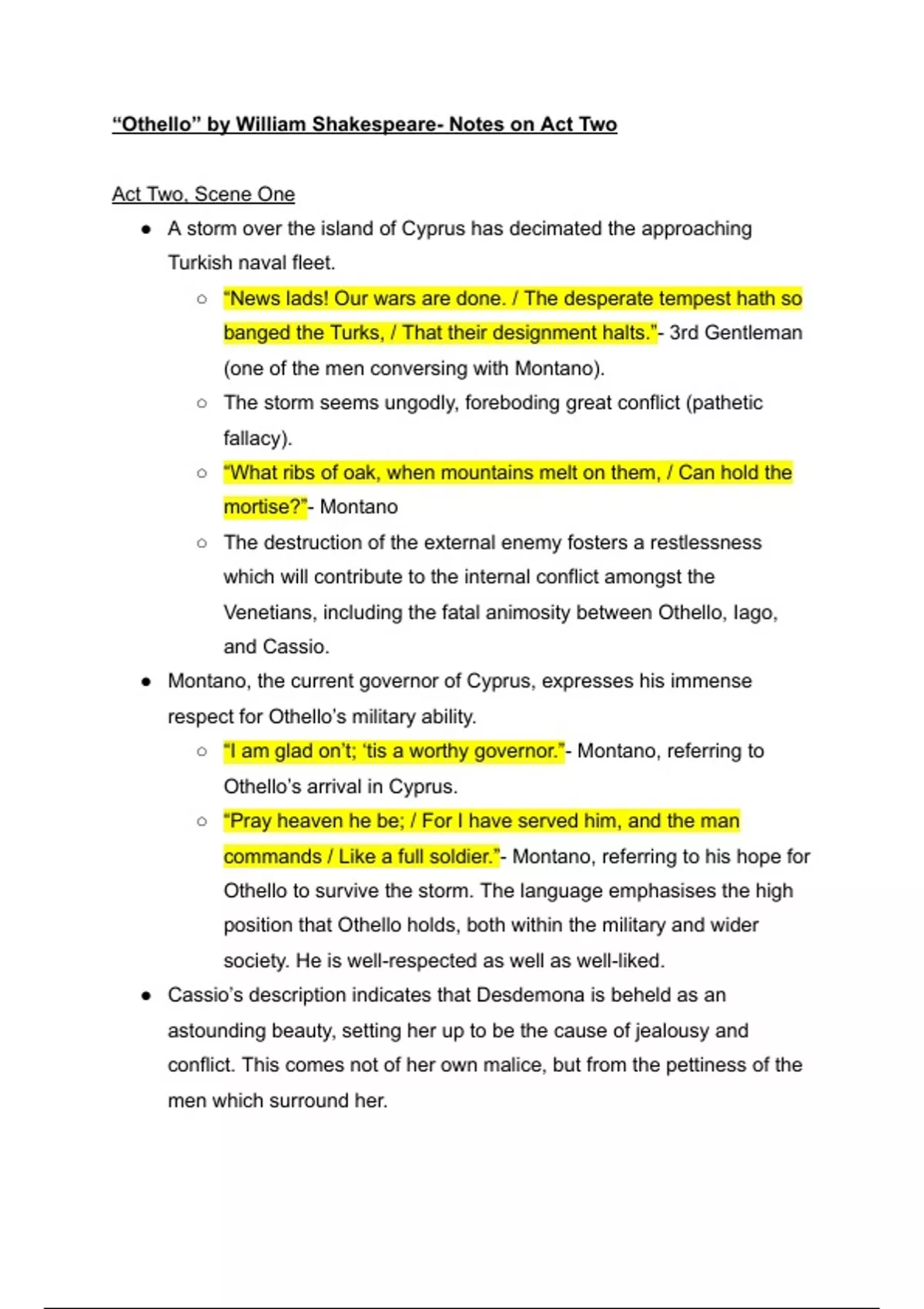 This document is an in-depth analysis of Act Two of "Othello" by William Shakespeare. This includes quotations and analysis of different characters. These notes are chronological and can be followed as you read along. Happy studying!