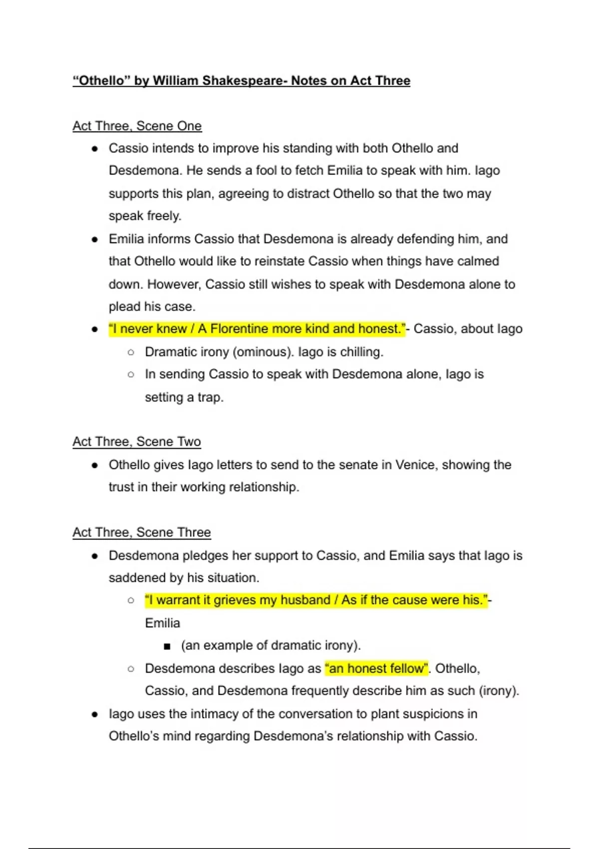 This document is an in-depth analysis of Act Three of "Othello" by William Shakespeare. This includes quotations and analysis of different characters. These notes are chronological and can be followed as you read along. Happy studying!