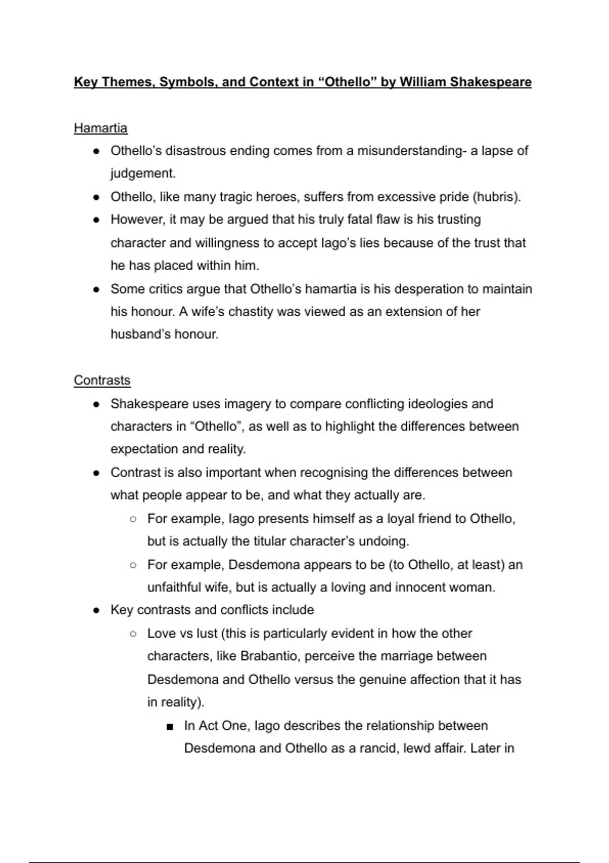 This document covers key themes (including hamartia, women, setting, and reputation) and context (including marriage in Jacobean England and classical mythology) for "Othello" by William Shakespeare. Happy studying!