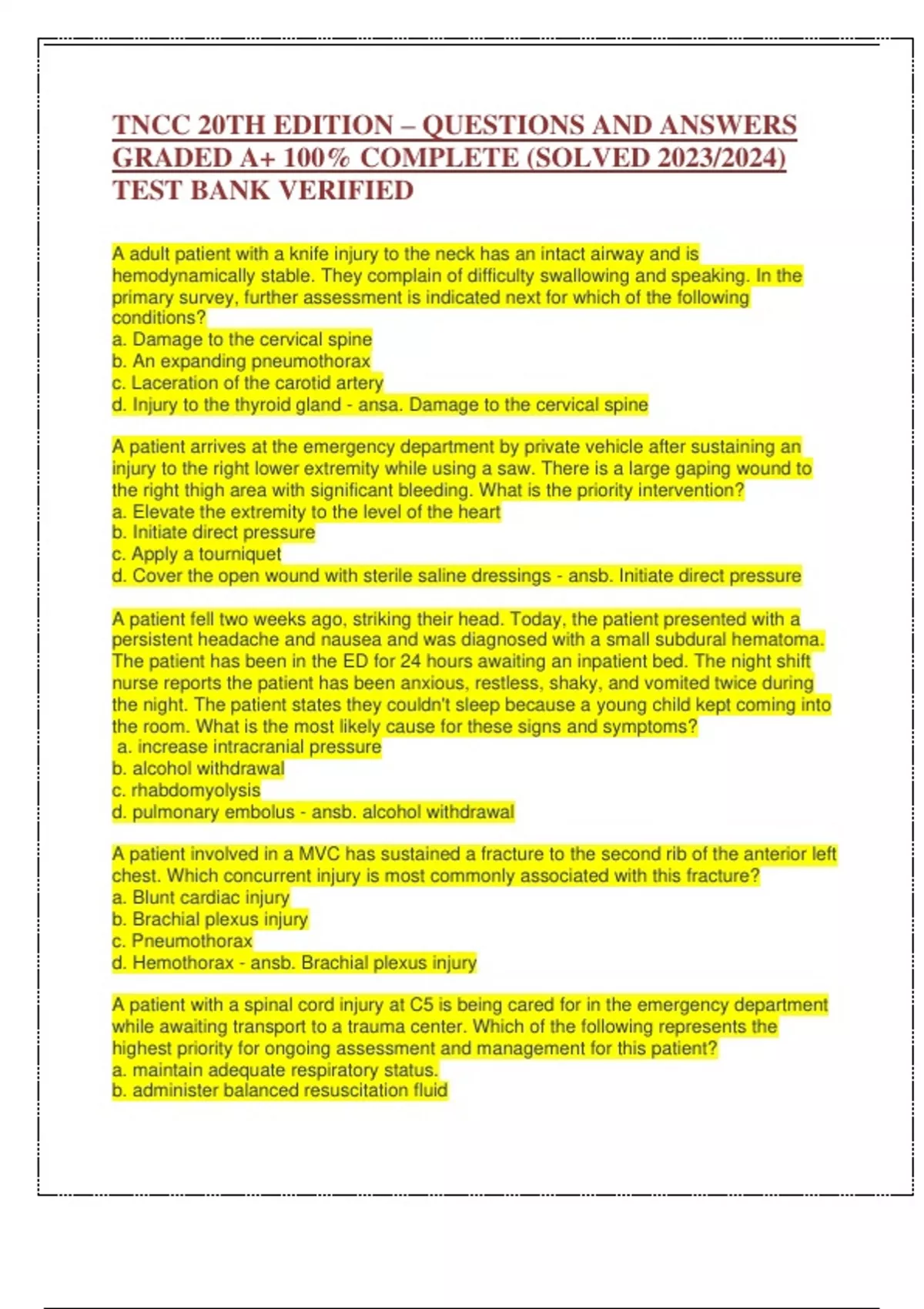 , TNCC 20TH EDITION – QUESTIONS AND ANSWERS