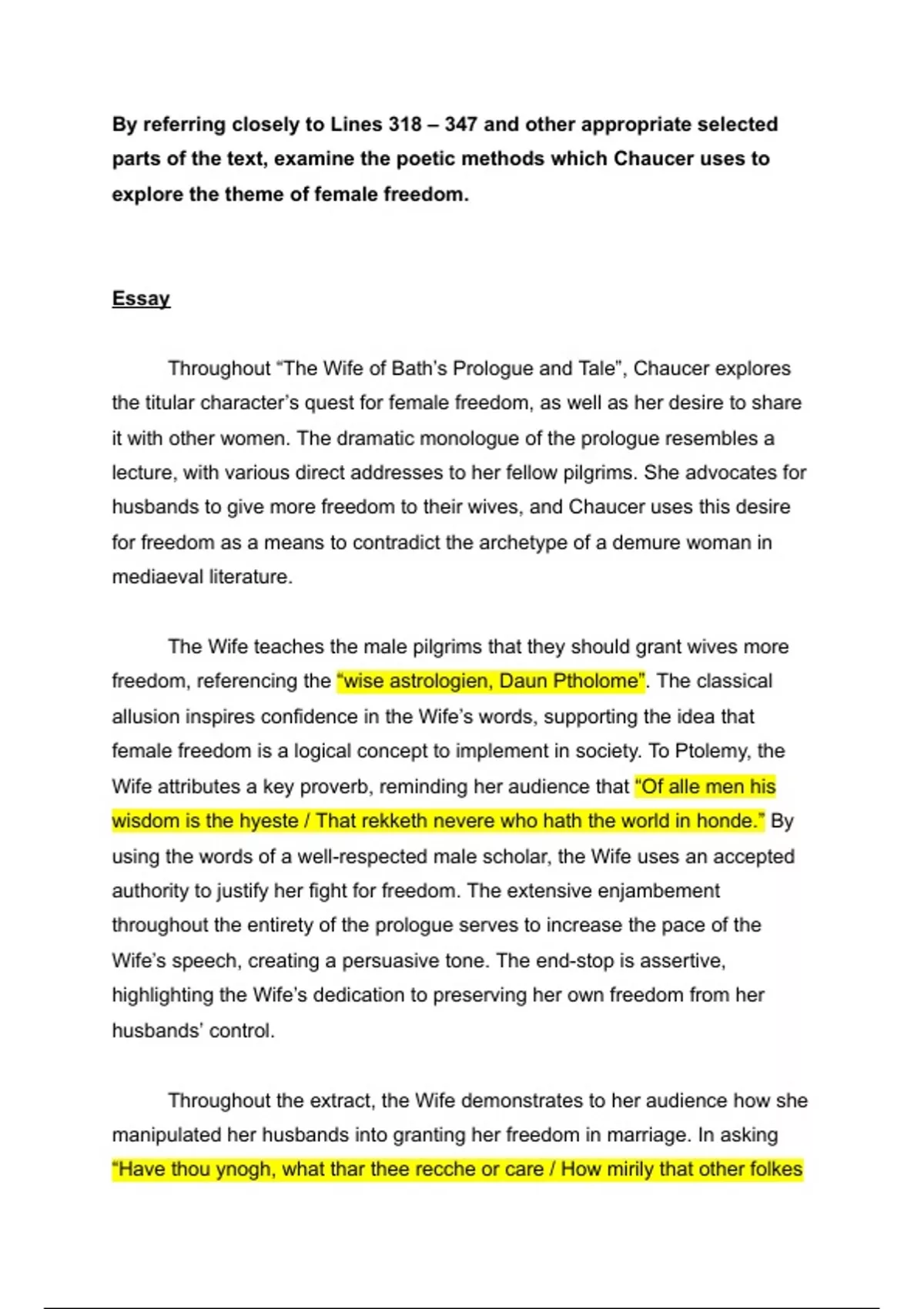 "By referring closely to Lines 318 – 347 and other appropriate selected parts of the text, examine the poetic methods which Chaucer uses to explore the theme of female freedom." This is an essay on "The Wife of Bath's Prologue and Tale" for A Level English Literature. I've also included an in-depth plan. Happy studying!