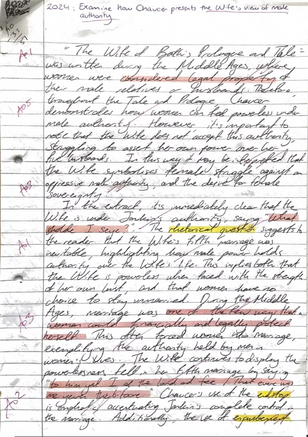 "Analyse how Chaucer presents the Wife's view of male authority". This is an A Level essay on "The Wife of Bath's Prologue and Tale" for English Literature. This essay is colour coded and annotated, and I have included feedback. Happy studying!