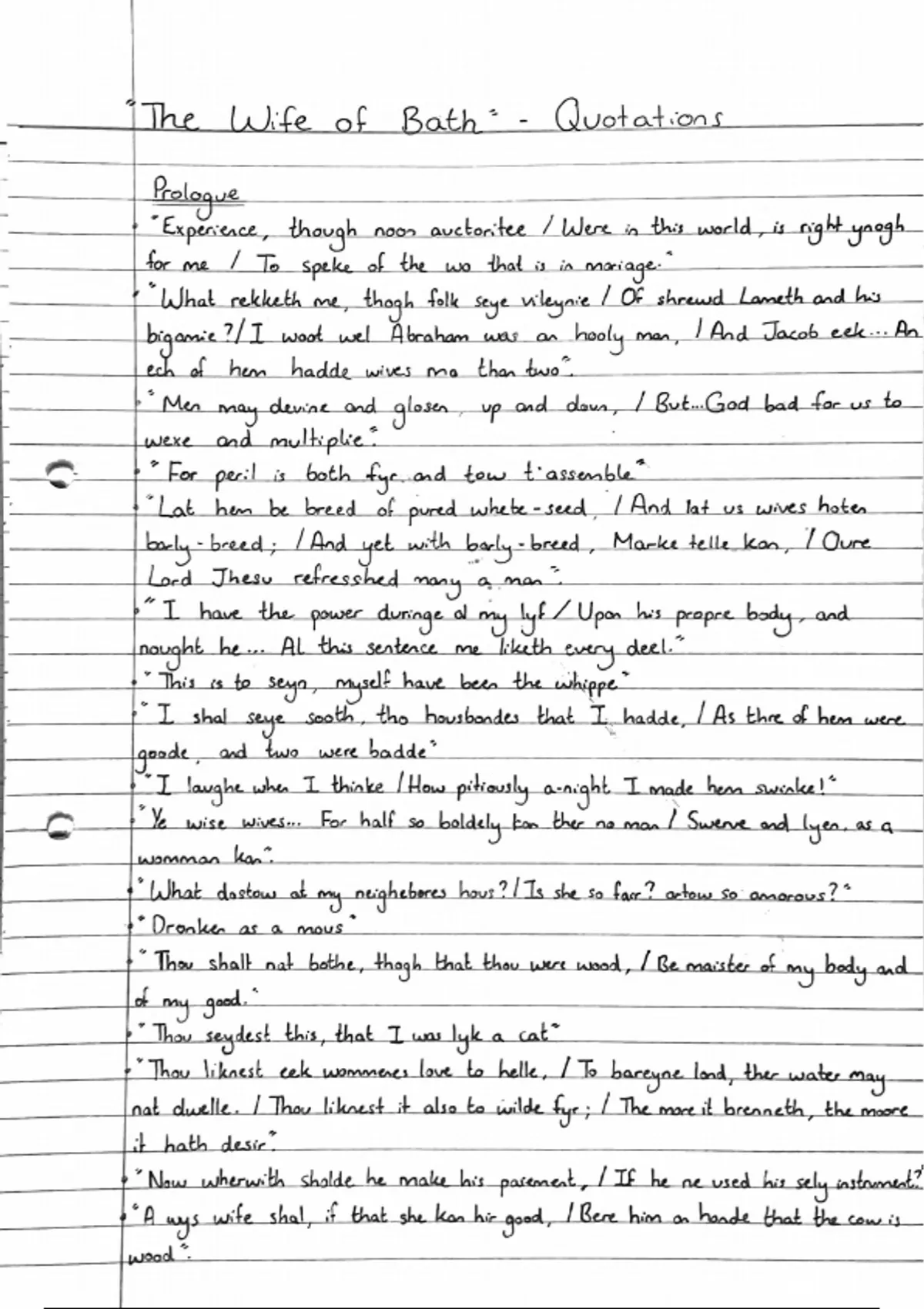 This document includes the key quotations in "The Wife of Bath's Prologue and Tale" that I learned for my A Level English Literature exam, as well as quotation-specific context. Happy studying!