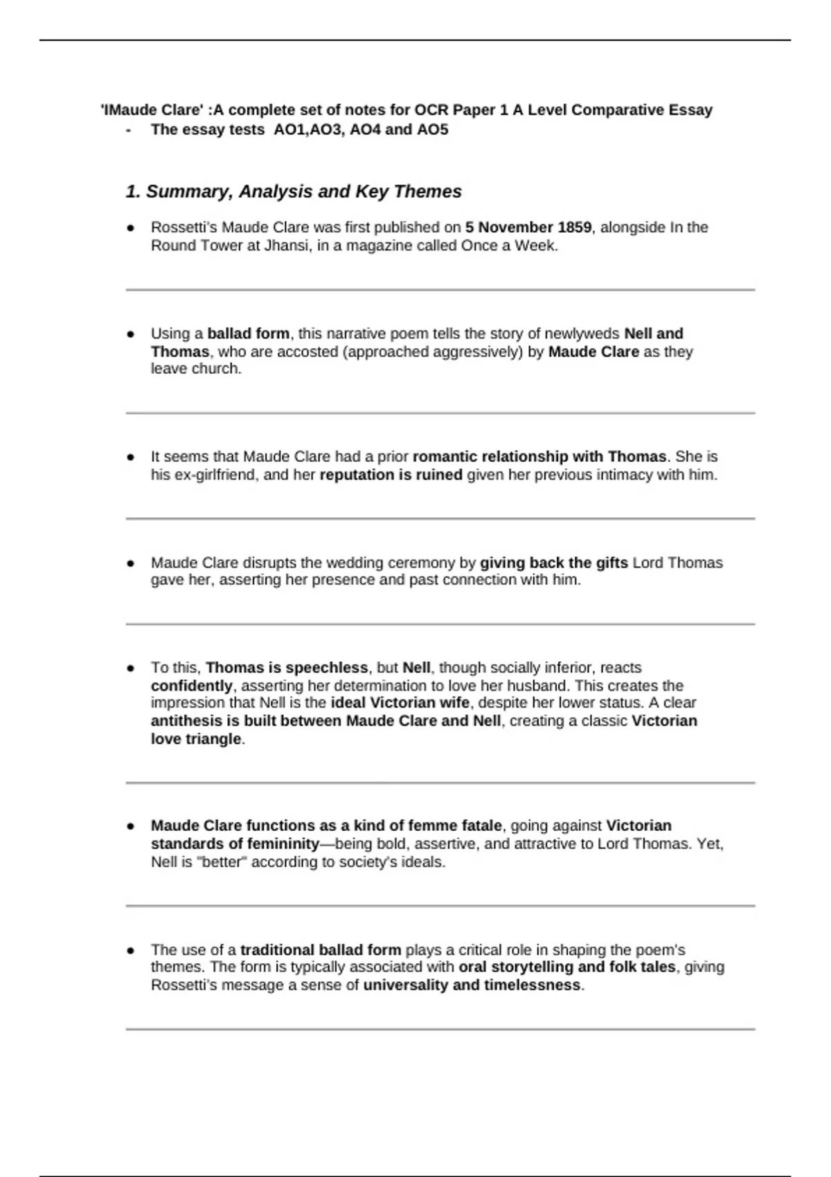 UPDATE- I have since achieved an A in this subject, being one mark off an A* with 186/200 marks. You can be confident that these notes are of high A* quality. A comprehensive and high-quality set of revision notes specifically designed for OCR A Level English Literature (Paper 1: Poetry and Drama). These notes cover Maude Clare in depth, perfect for comparative study with A Doll’s House. Included in this resource: Full poem summary and analysis with key themes clearly outlined Theme-by-theme breakdown with embedded quotations and detailed commentary Direct AO4 links to Ibsen’s A Doll’s House to boost comparative marks Contextual (AO3) insights including religion, fallen women, and Victorian society Critical interpretations (AO5) from scholars such as Simon Avery, Elizabeth Helsinger, and Josephine Pearce Carefully corrected SPaG for clarity and examiner-friendly reading These notes are designed to match the OCR specification requirements and give you the edge in achieving A or A* responses. I myself have used this to get A* predicted, score 26+/30 on all my mock essays, and for moy actual 2025 exams.
