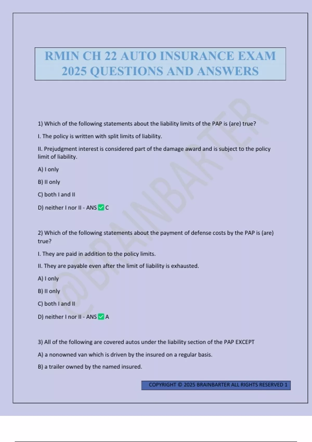 1) Which of the following statements about the liability limits of the PAP is (are) true? I. The policy is written with split limits of liability. II. Prejudgment interest is considered part of the damage award and is subject to the policy limit of liability. A) I only B) II only C) both I and II D) neither I nor II - ANS C 2) Which of the following statements about the payment of defense costs by the PAP is (are) true? I. They are paid in addition to the policy limits. II. They are payable even after the limit of liability is exhausted. A) I only B) II only C) both I and II D) neither I nor II - ANS A 3) All of the following are covered autos under the liability section of the PAP EXCEPT A) a nonowned van which is driven by the insured on a regular basis. B) a trailer owned by the named insured. COPYRIGHT © 2025 BRAINBARTER ALL RIGHTS RESERVED 2 C) a borrowed auto used by the insured as a substitute for a stolen covered auto. D) a newly acquired auto which replaces a vehicle previously described in the policy. - ANS A 4) All of the following are insured persons under the liability coverage of the PAP EXCEPT A) a friend to whom the named insured loans a covered auto. B) the employer of the named insured for actions resulting from the named insuredʹs use of a covered auto. C) the former spouse of the named insured who moved out of the home 2 years ago when the divorce was finalized. D) a relative of the named insured if a member of the same household. - ANS C 5) Which of the following persons is (are) covered for liability insurance under the PAP? I. A family member who drives a covered auto. II. A family member who occasionally drives a friendʹs auto. A) I only B) II only C) both I and II D) neither I nor II - ANS C 6) All of the following are covered as supplementary payments under the liability section of the PAP EXCEPT A) the cost of an appeal bond in a lawsuit. B) the cost of a bail bond for a traffic violation when no accident is involved. C) interest which accrues on a liability judgment covered by the policy. D) reasonable expenses incurred by the insured to testify at a trial involving a lawsuit covered by the policy. - ANS B 7) Which of the following situations would be covered by the liability section of an unendorsed PAP if the insured is l