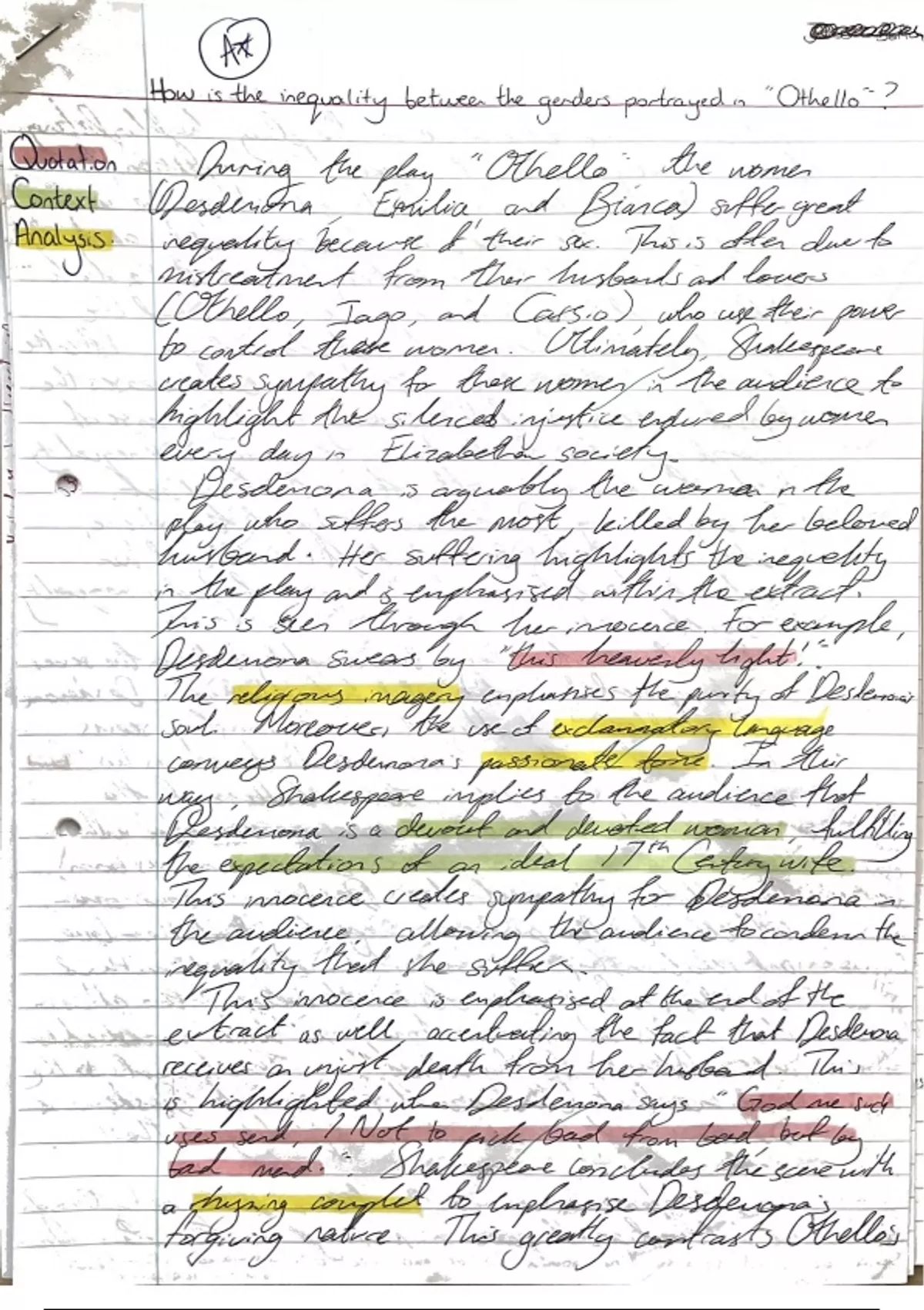 "How is the inequality between the genders portrayed in 'Othello'?" This is an A Level Essay on "Othello" which received an A* grade. This is a colour coded, annotated copy of the essay with feedback. Happy studying!