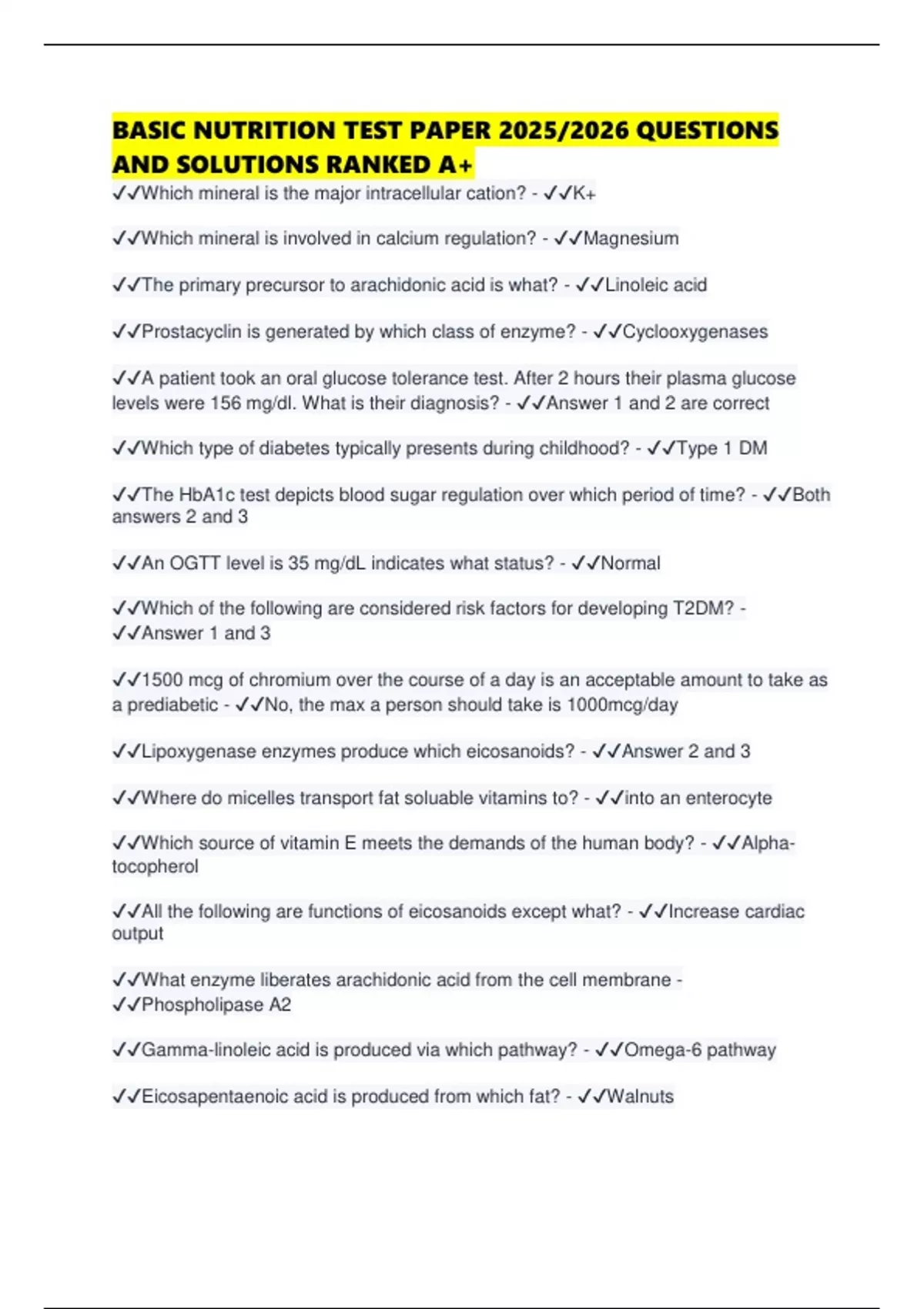 BASIC NUTRITION TEST PAPER 2025/2026 QUESTIONS AND SOLUTIONS RANKED A+