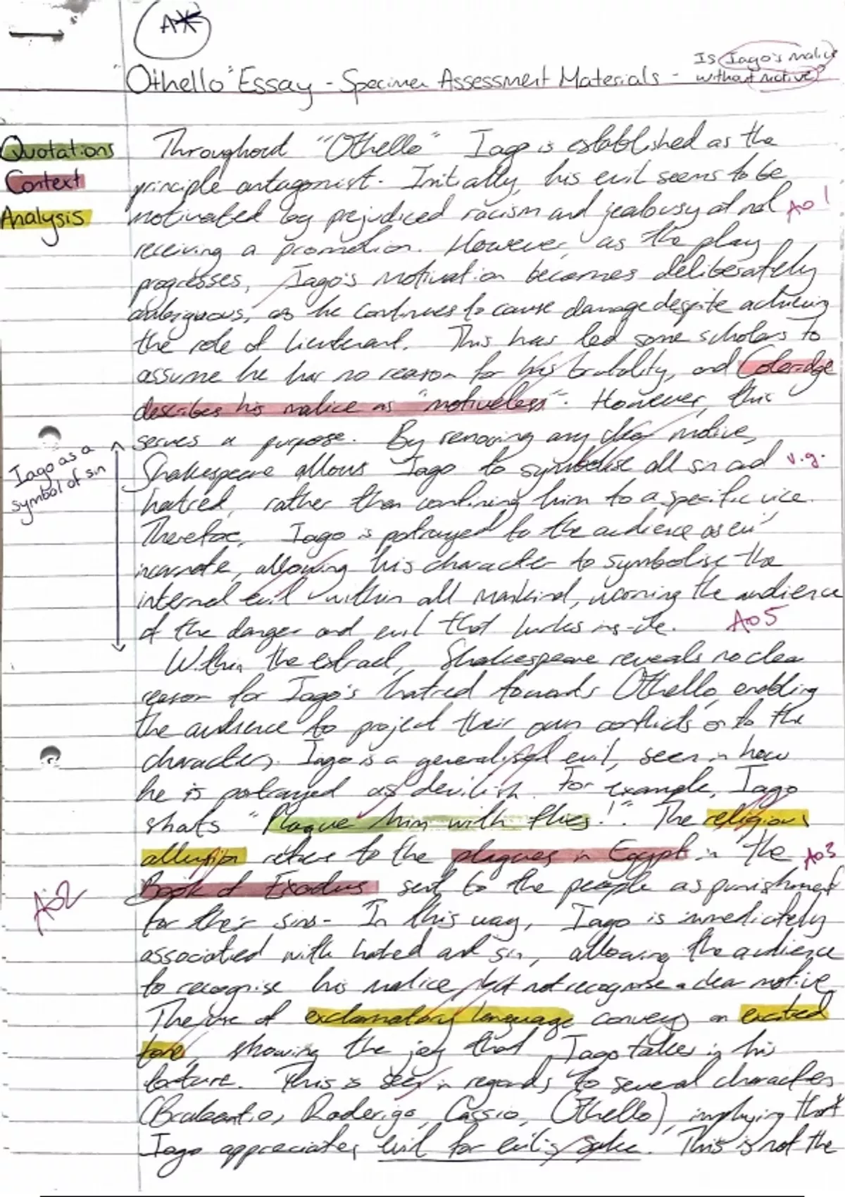 This is an A Level English Literature essay on the character of Iago from Shakespeare's "Othello" which received an A* grade. This essay is annotated, colour coded, and includes both an essay plan and feedback. Happy studying!
