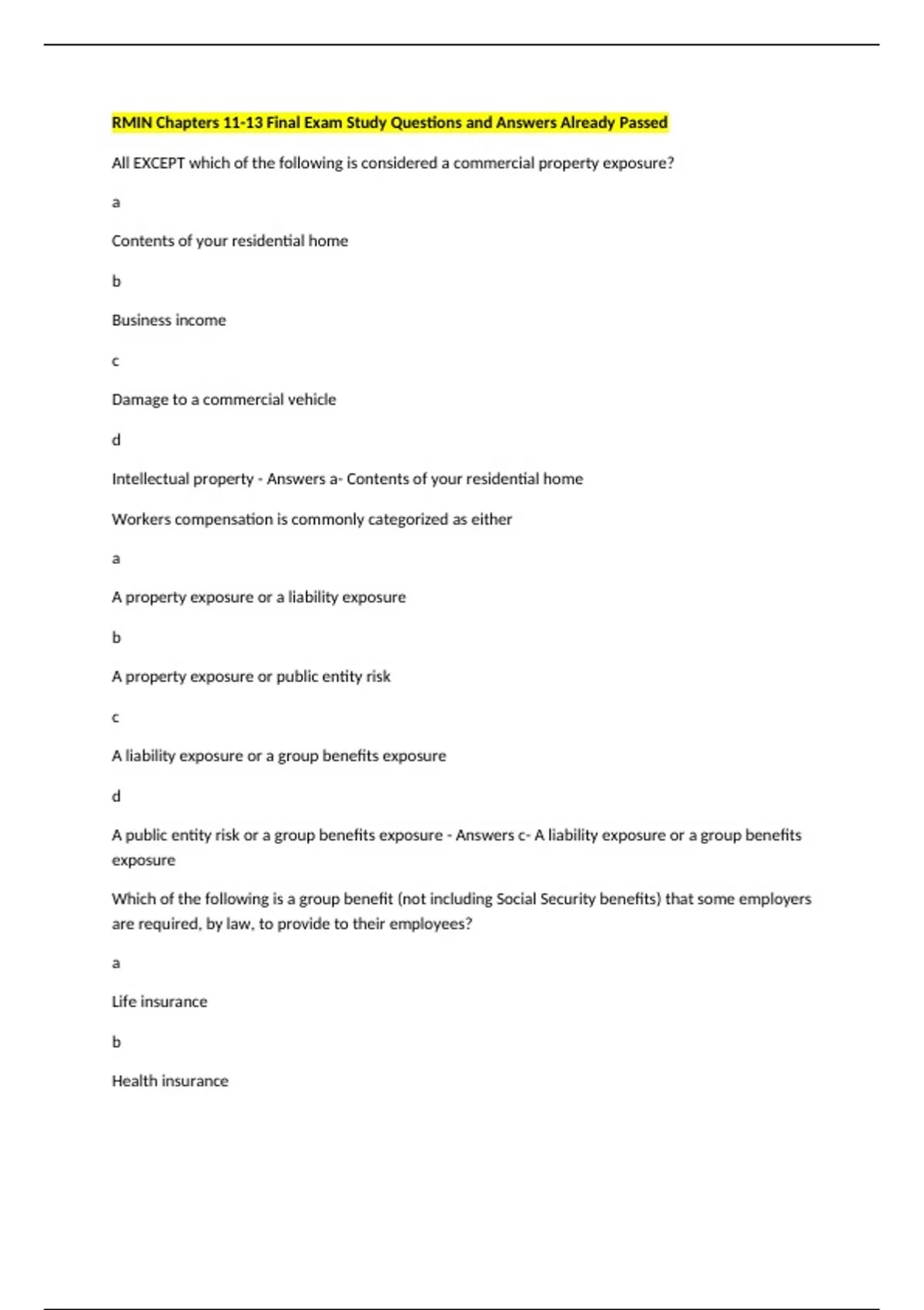 RMIN Chapters 11-13 Final Exam Study Questions and Answers Already Passed All EXCEPT which of the following is considered a commercial property exposure? a Contents of your residential home b Business income c Damage to a commercial vehicle d Intellectual property - Answers a- Contents of your residential home Workers compensation is commonly categorized as either a A property exposure or a liability exposure b A property exposure or public entity risk c A liability exposure or a group benefits exposure d A public entity risk or a group benefits exposure - Answers c- A liability exposure or a group benefits exposure Which of the following is a group benefit (not including Social Security benefits) that some employers are required, by law, to provide to their employees? a Life insurance b Health insurance c Retirement annuities d Disability insurance - Answers b- Health insurance Insurance that covers the "city hall" building would fall under what common categorization of insurance? a Metropolitan insurance b Government insurance