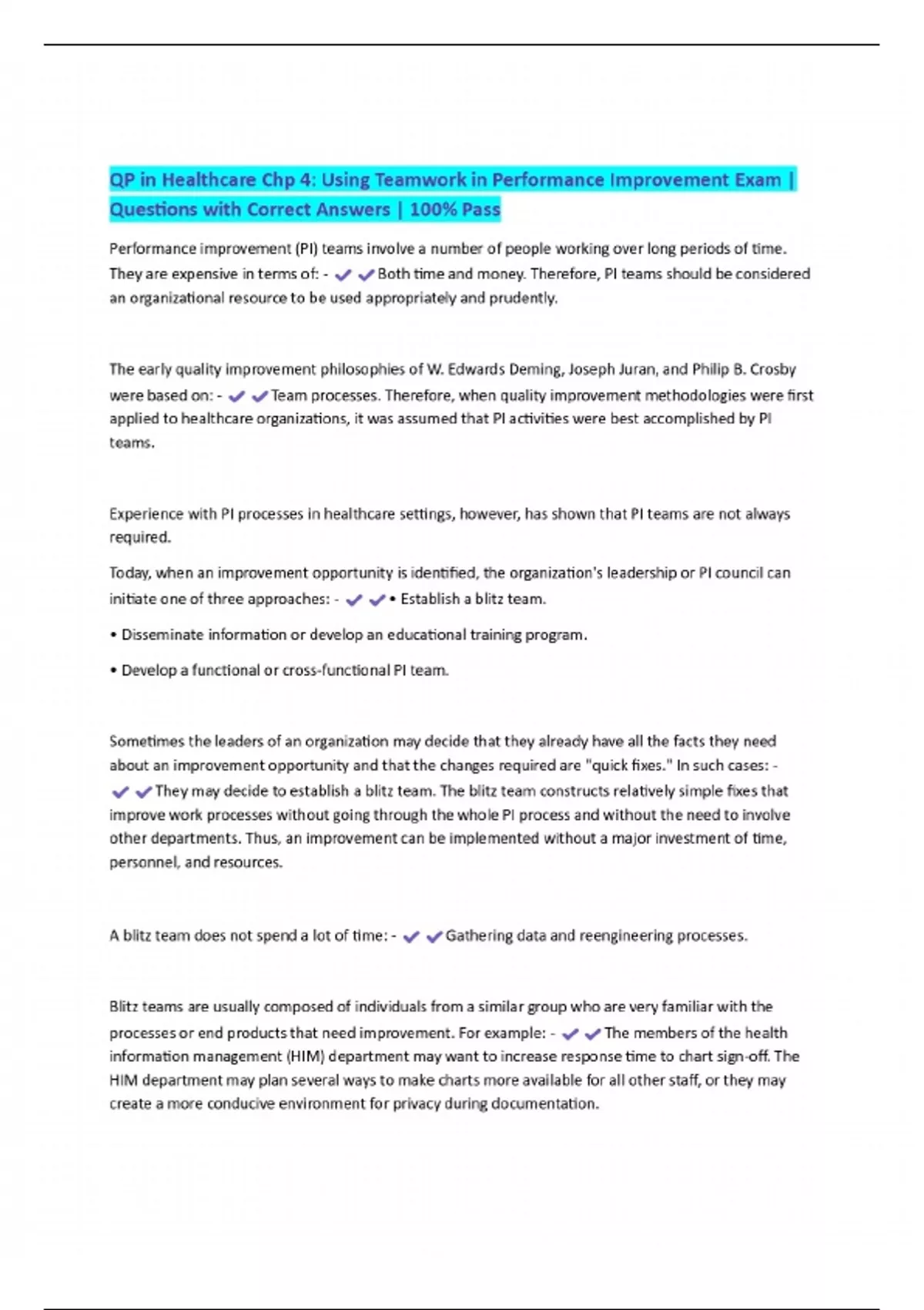 QP in Healthcare Chp 4: Using Teamwork in Performance Improvement Exam | Questions with Correct Answers | 100% Pass