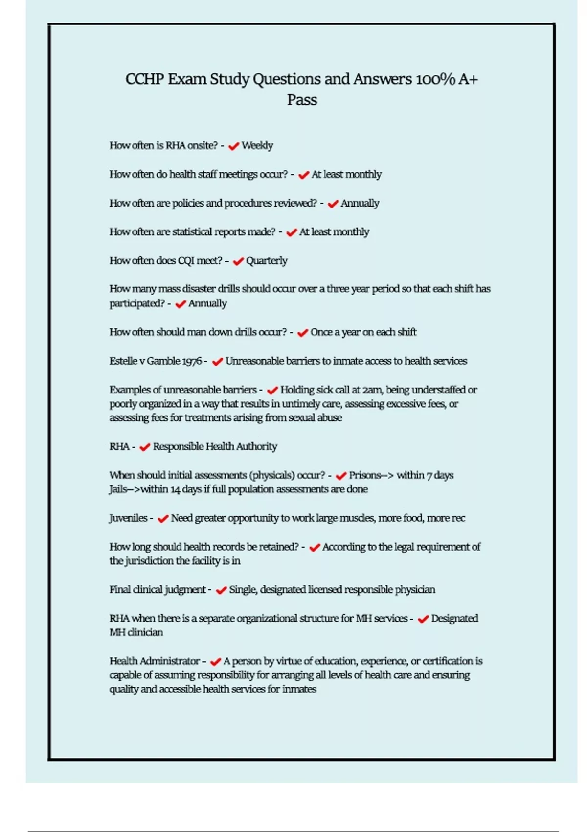 CCHP Exam Study Questions and Answers 100% A+ Pass How often is RHA onsite? - Weekly How often do health staff meetings occur? - At least monthly How often are policies and procedures reviewed? - Annually How often are statistical reports made? - At least monthly How often does CQI meet? - Quarterly How many mass disaster drills should occur over a three year period so that each shift has participated? - Annually How often should man down drills occur? - Once a year on each shift Estelle v Gamble 1976 - Unreasonable barriers to inmate access to health services Examples of unreasonable barriers - Holding sick call at 2am, being understaffed or poorly organized in a way that results in untimely care, assessing excessive fees, or assessing fees for treatments arising from sexual abuse RHA - Responsible Health Authority When should initial assessments (physicals) occur? - Prisons--> within 7 days Jails-->within 14 days if full population assessments are done Juveniles - Need greater opportunity to work large muscles, more food, more rec How long should health records be retained? - According to the legal requirement of the jurisdiction the facility is in Final clinical judgment - Single, designated licensed responsible physician RHA when there is a separate organizational structure for MH services - Designated MH clinician Health Administrator - A person by virtue of education, experience, or certification is capable of assuming responsibility for arranging all levels of health care and ensuring quality and accessible health services for inmates Qualified health care professionals - Physicians, PAs, nurses, NPs, dentists, MHPs, and others who are permitted by law to evaluate and care for patients