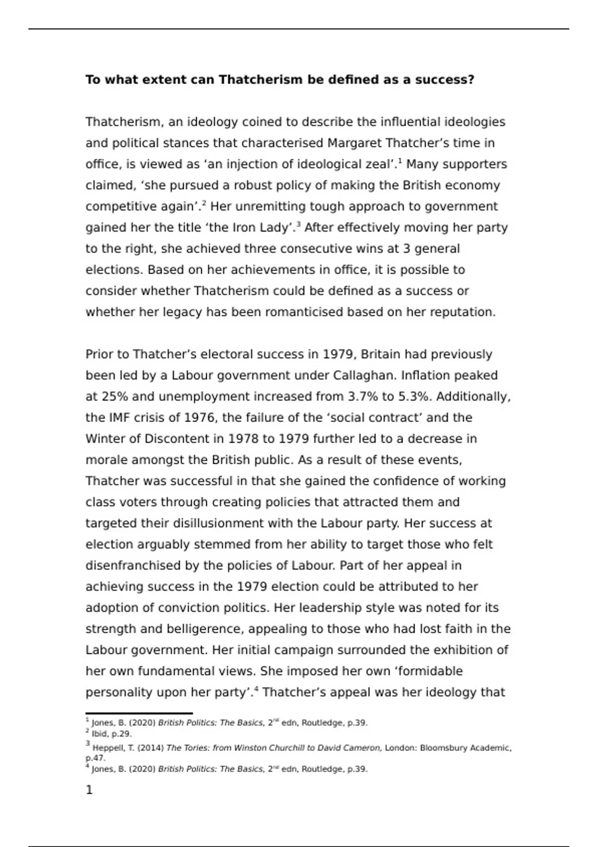 My University of Leeds British Politics assessment. 'To what extent can Thatcherism be defined as a success?' I scored 65/100 on this.