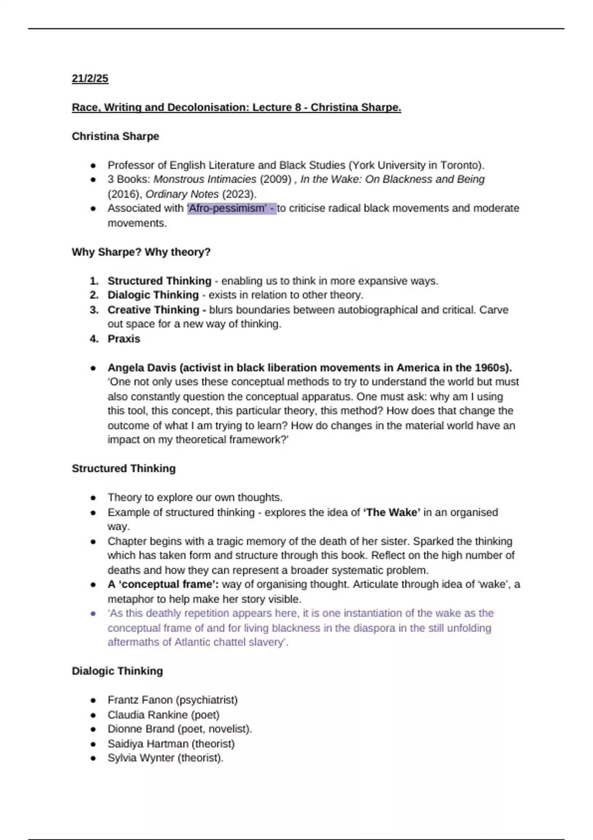 Race, Writing and Decolonisation: Lecture 8 - Christina Sharpe.