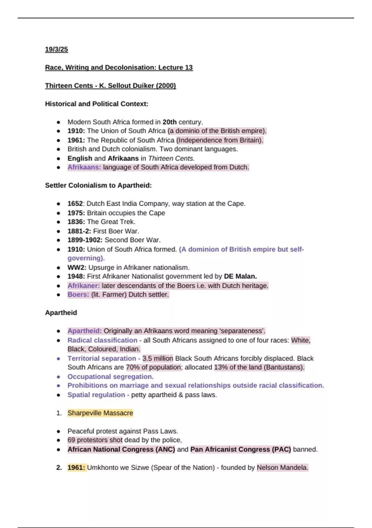 Race, Writing and Decolonisation: 'Thirteen Cents' Lecture Notes.