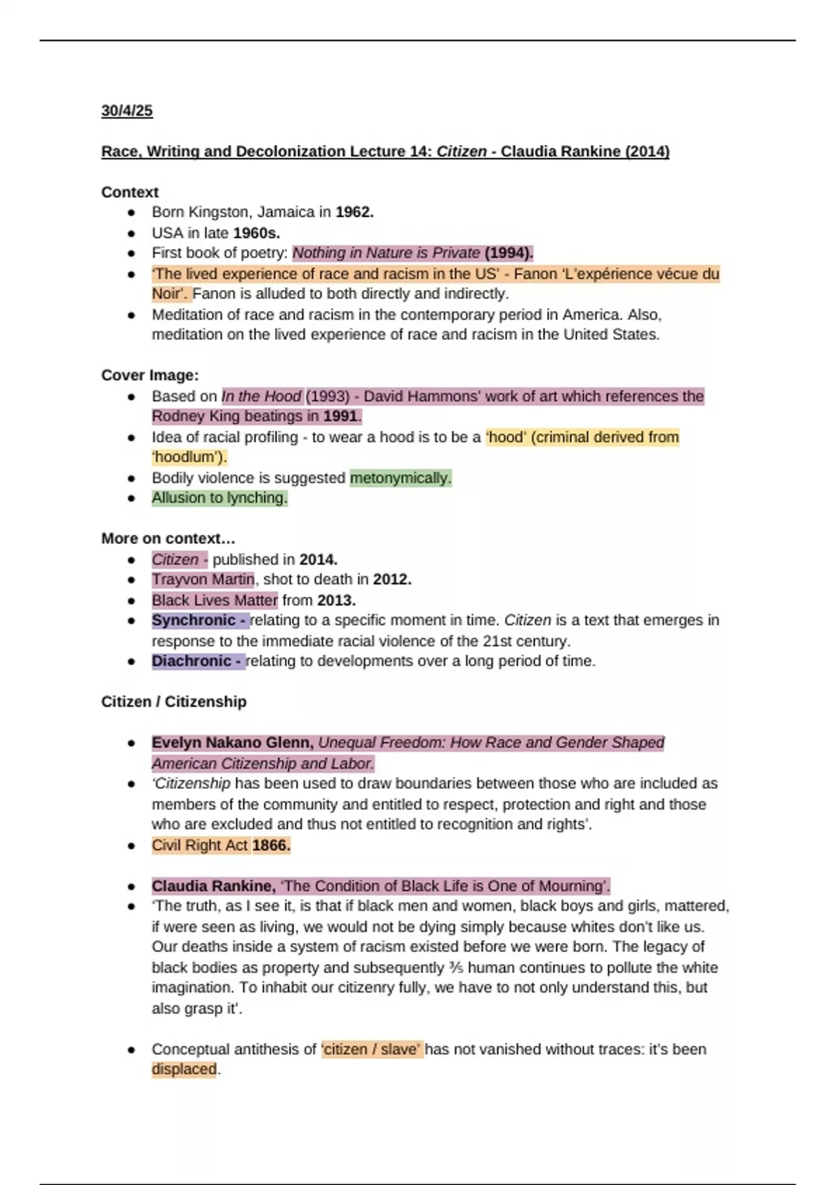● Synchronic - relating to a specific moment in time. Citizen is a text that emerges in