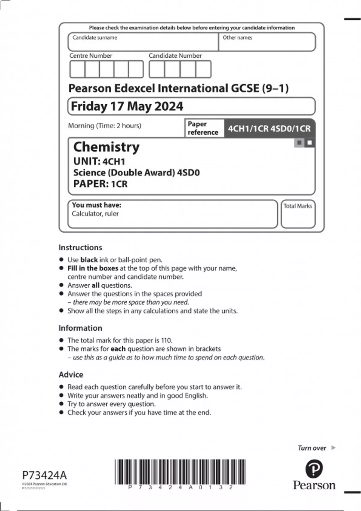 IGCSE Chemistry 4CH1/1CR – Pearson Edexcel – May 2024 – Complete Exam Paper with Structured Questions