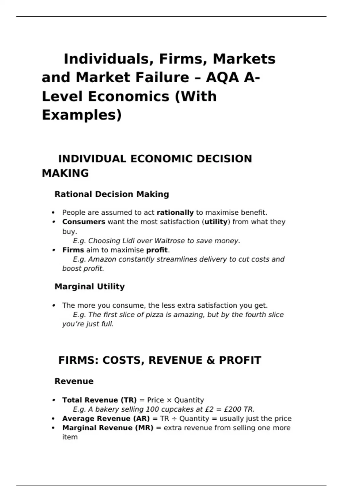 This document is a super clear, straightforward guide to the AQA A-Level Economics topic Individuals, Firms, Markets and Market Failure. It’s written in a way that feels like someone just sitting down with you and explaining the key ideas — no waffle, no overcomplicated jargon, just the stuff you actually need to understand. It covers everything from how consumers and firms make decisions, to how markets work (and sometimes don’t). It breaks down trickier ideas like marginal utility, elasticity, market structures, and government intervention in plain English, with real-world examples to help it click. So instead of just saying “monopoly power leads to inefficiency,” it’ll say something like “think of Google’s dominance in the search engine market.” The layout is easy to follow — short sections, bullet points, and lots of examples to keep things digestible. It's the kind of revision material you'd wish you'd had earlier: simple, accurate, and made to actually help things stick. It’s perfect for anyone studying AQA A-Level Economics, especially if you prefer learning with examples and clear, no-nonsense notes rather than dense textbook paragraphs.