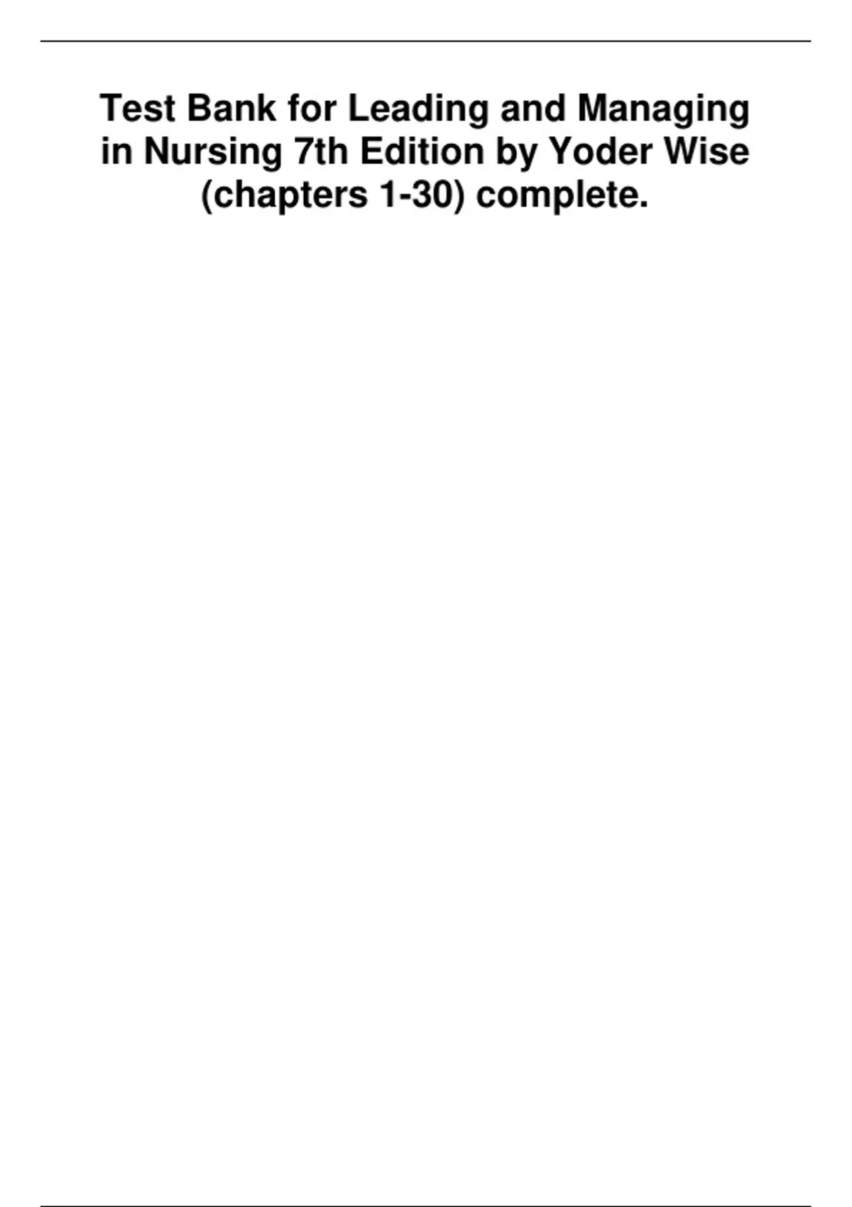 Get fully prepared for nursing leadership and management exams with this complete test bank for Leading and Managing in Nursing, 7th Edition by Yoder-Wise. Covers all 30 chapters with 100% verified and updated questions and answers. Perfect for BSN, RN-to-BSN, and MSN programs, this resource enhances your understanding of leadership roles, healthcare delivery, staffing, budgeting, and decision-making in modern nursing. Ideal for 2024–2026 learners, this downloadable PDF offers accurate content aligned with current exam standards. Save time and boost your grades with this trusted study guide.