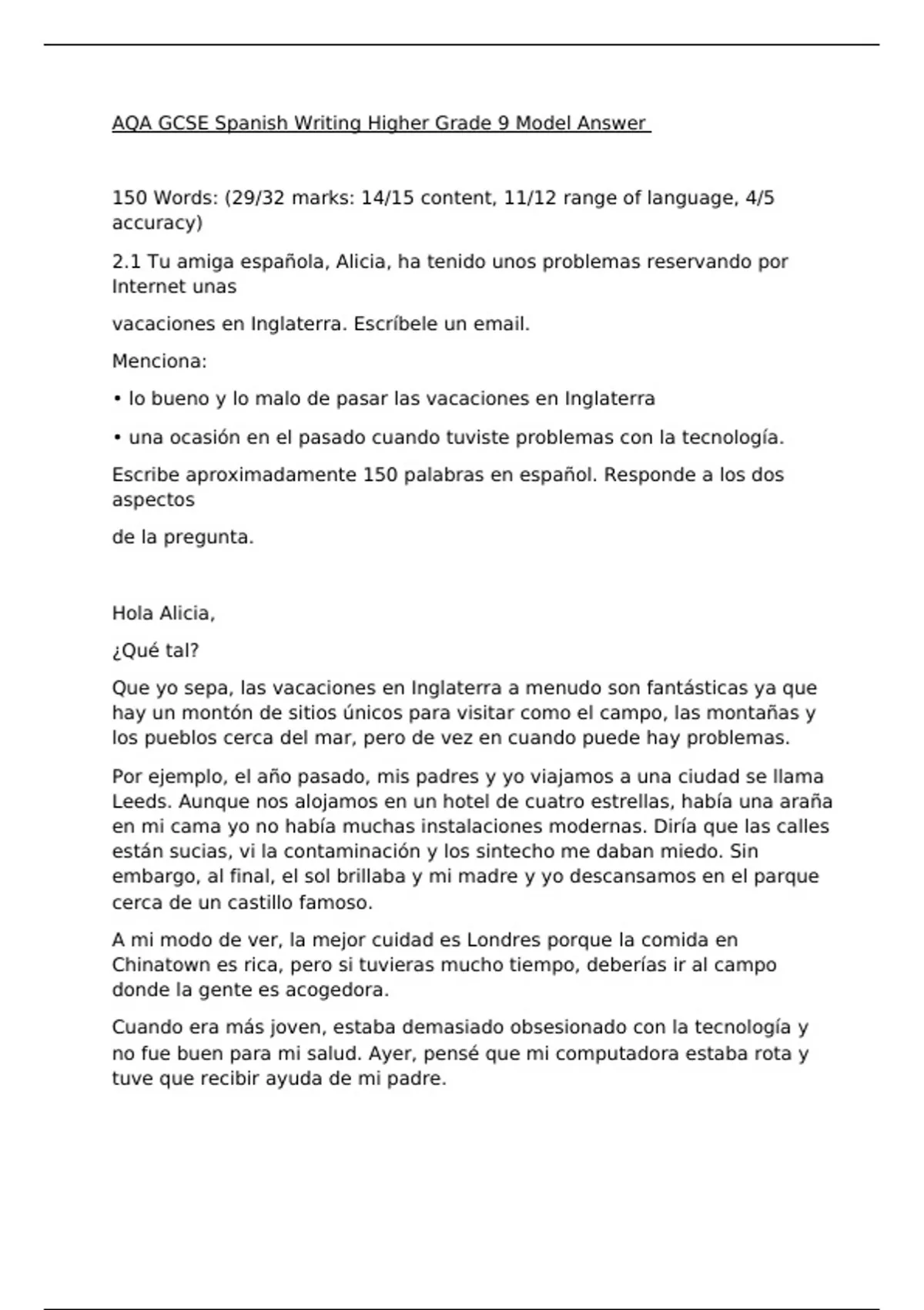 AQA GCSE Spanish Writing Higher Grade 9 Model Answer