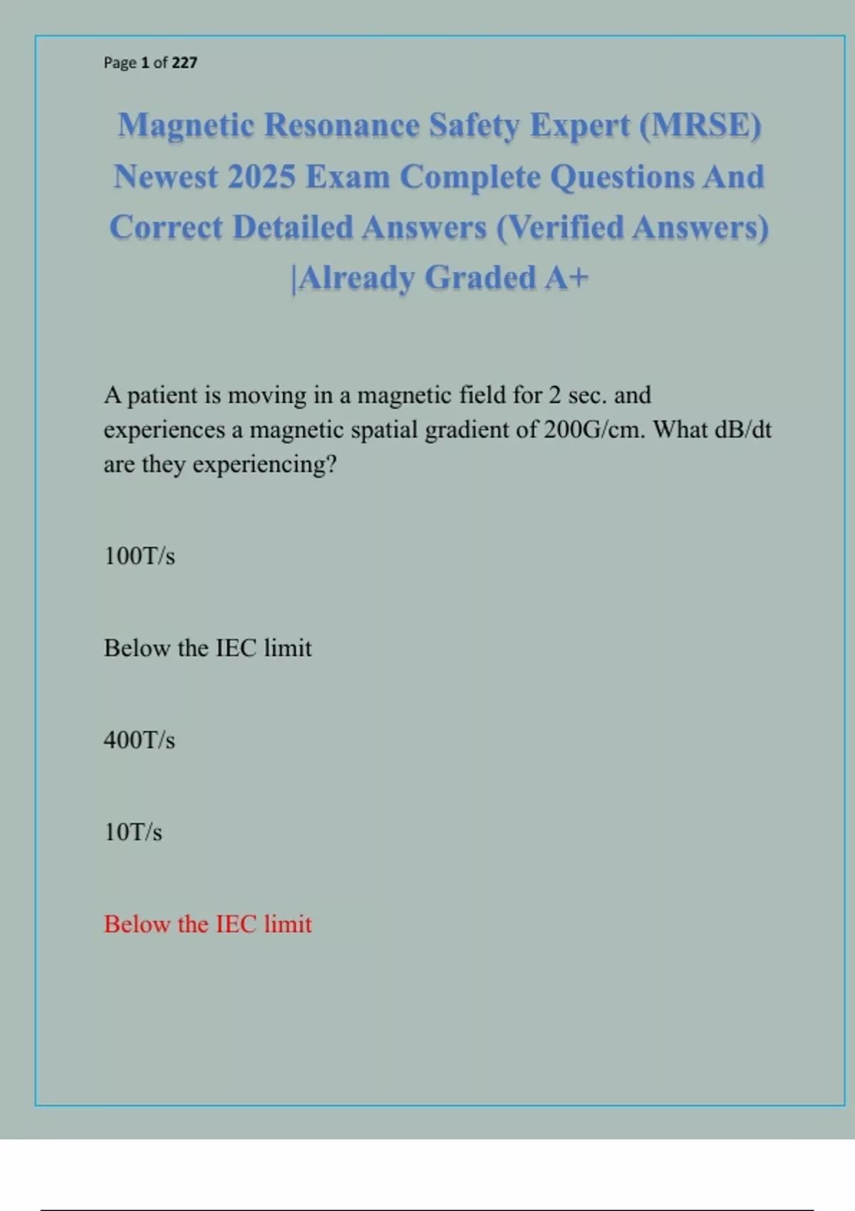 Magnetic Resonance Safety Expert (MRSE) Newest 2025 Exam Complete Questions And Correct Detailed Answers (Verified Answers) |Already Graded A+